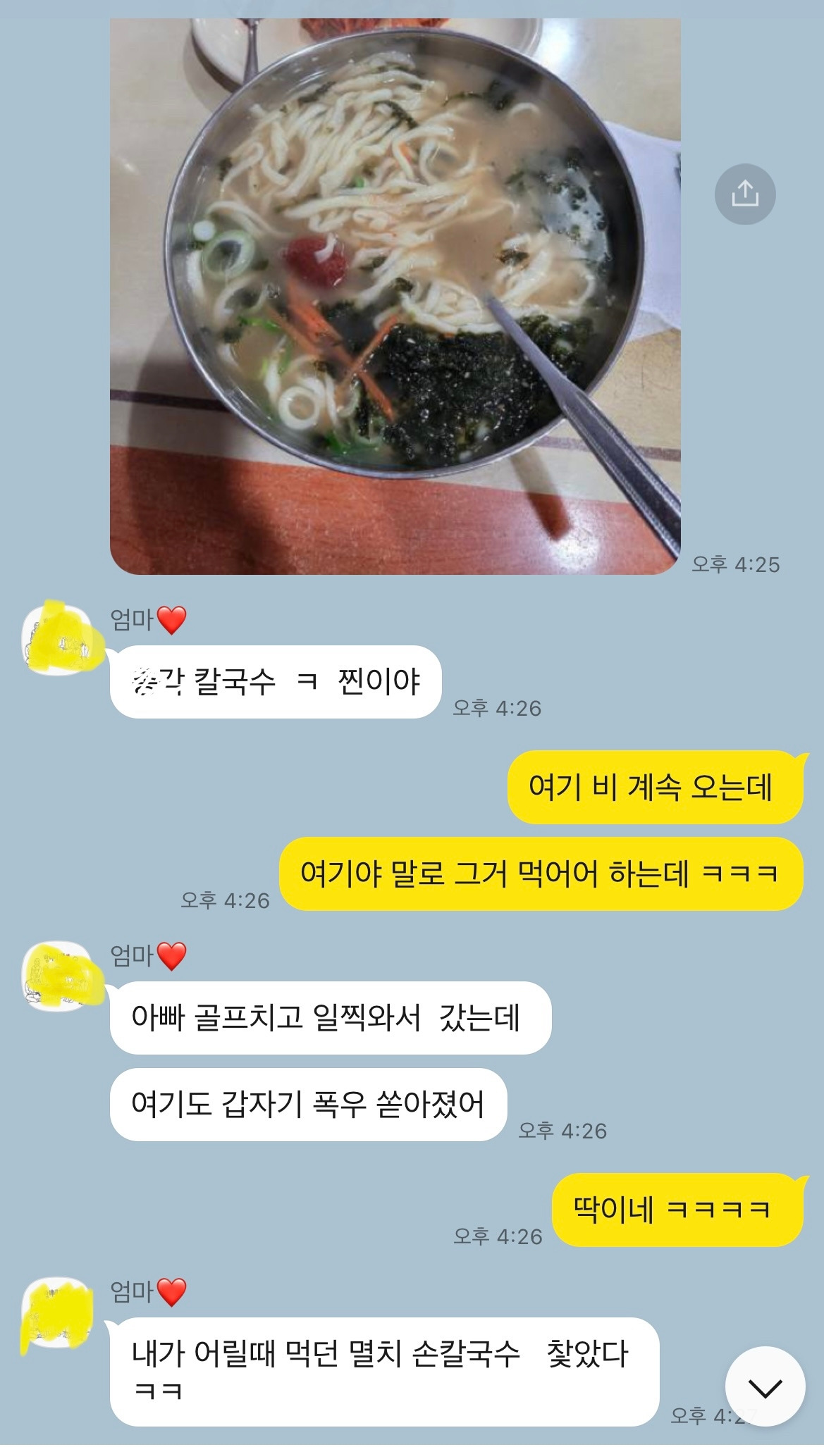 비가 와서 엄마는 아빠랑 칼국수집에 왔다며 사진을 보내왔다.