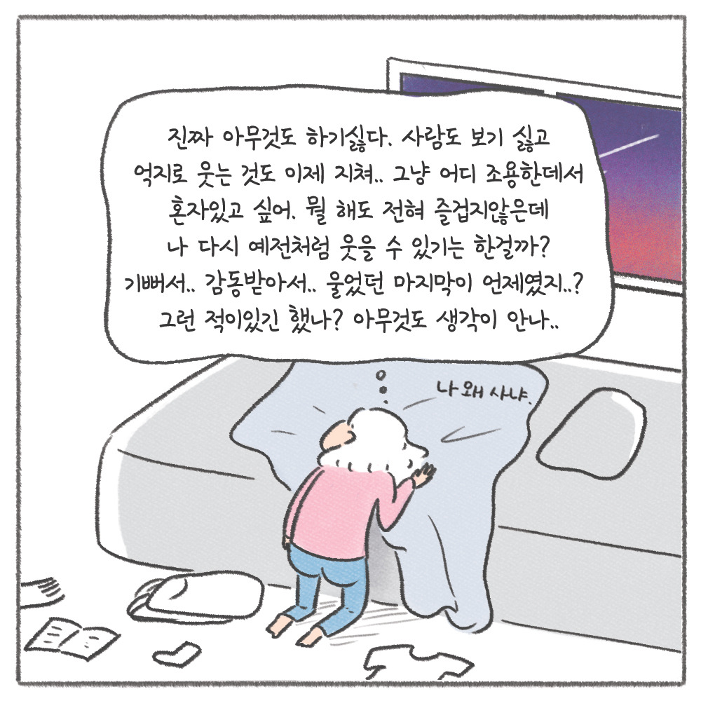 마음이 크게 무너져내려 그 상태로 오랫동안 지속되어왔다면 아무리 즐거운 상황에 나를 놓는다 할지라도 근본적으로 치유가 되지 않는다. 겉으로는 밝게 웃고 있을지라도 어쩌면 진짜 웃고 있는 게 아닐 수 있다. 그 속마음은 본인이 아닌 이상 아무도 모르겠지.