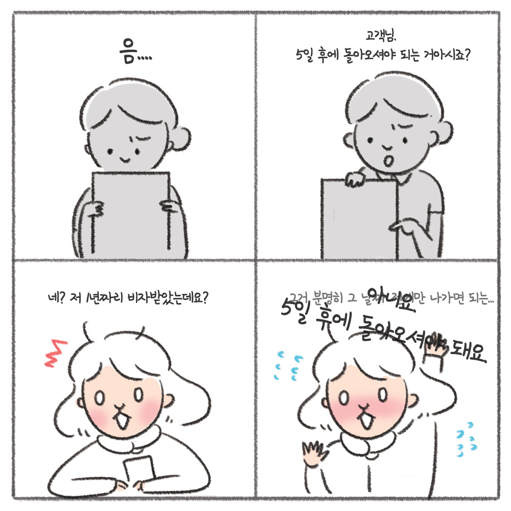 라는 단호한 공항직원의 말에 순간 '내가 잘못 알았나?'라는 생각에 등줄기에 식은땀이 나기 시작했다. 하필 이날은 집에서 느긋하게 나온 게 또 화근이었다. 평소 같았으면 2-3시간 전에는 미리 와있는 공항이었지만 매번 갈 때마다 한참 기다렸던 게 생각이 나서 시간 맞춰서 왔던 거다. 비행기 이륙시간도 얼마 남지 않았는데 무슨 청천벽력 같은 얘기람. 5일 후에 다시 돌아와야 한다고? 내가 그럴 리 없다고 계속 얘기하자 그제야 자리에서 일어난 공항직원은 다른 직원에게 확인하더니 착오가 있었다며 미소를 지었다.