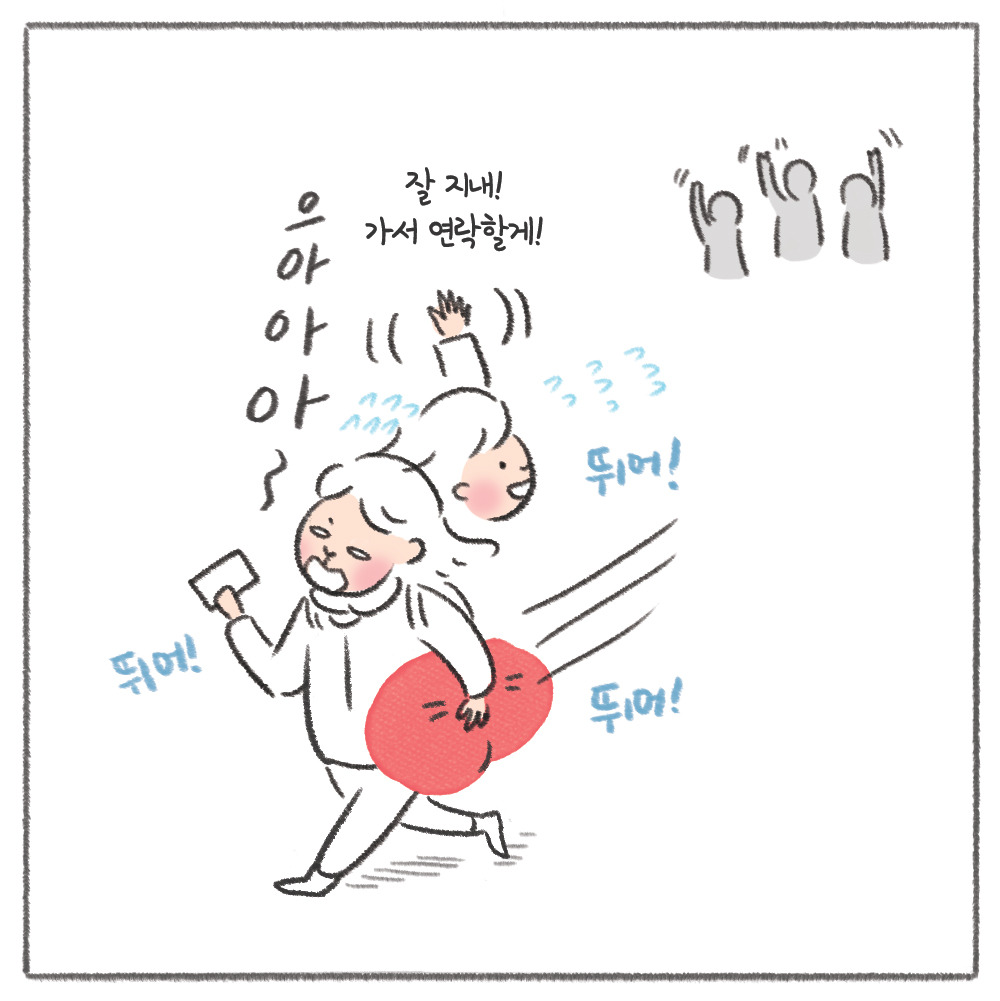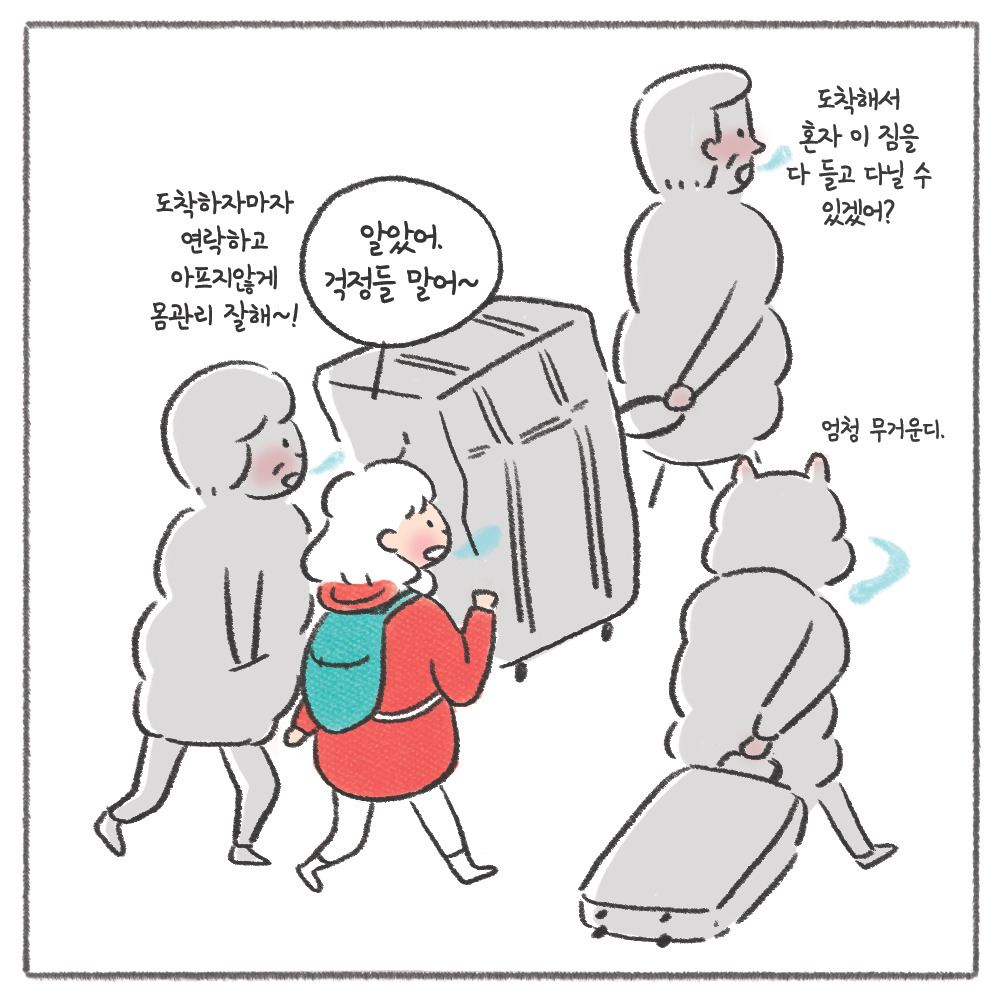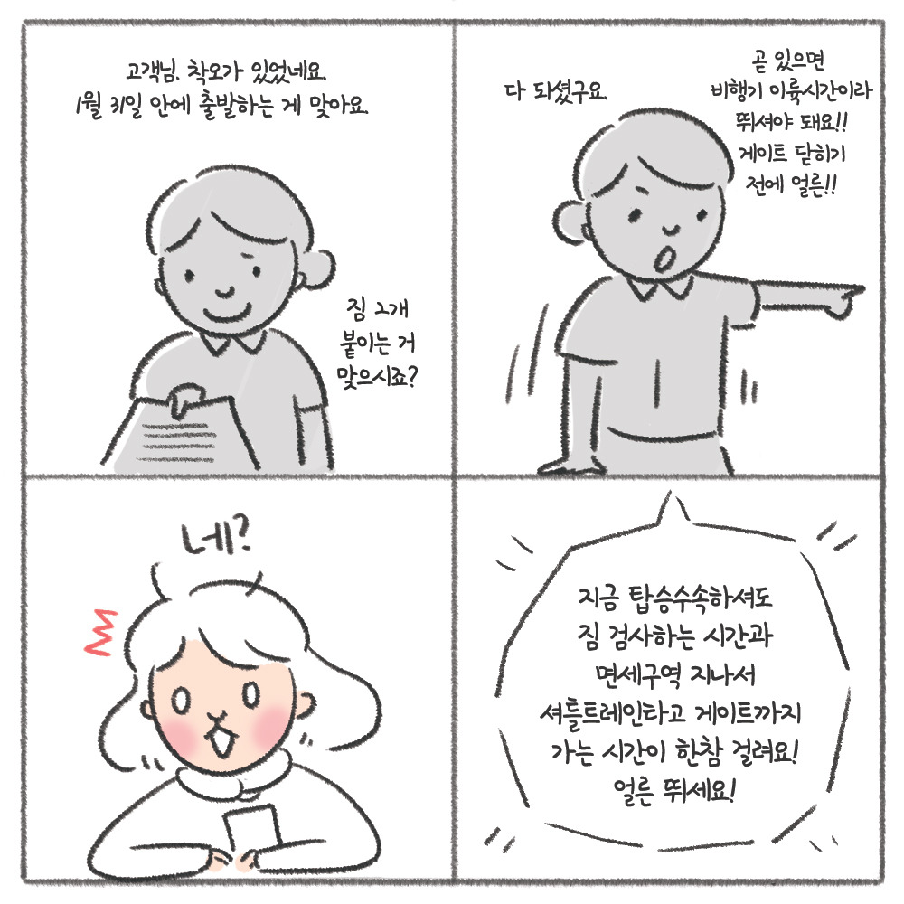 시간은 이미 한참이나 지체됐고, 짐을 부치자마자 나는 가족들에게 인사도 제대로 못하고 미친 듯이 달려야 했다. 짧게 여행하다가 금방 돌아올 사람처럼 "잘 갔다 올게!" 한마디 인사와 함께. 여행의 첫 시작부터 심장 졸리는 에피소드가 벌써 하나 생겨버렸다.