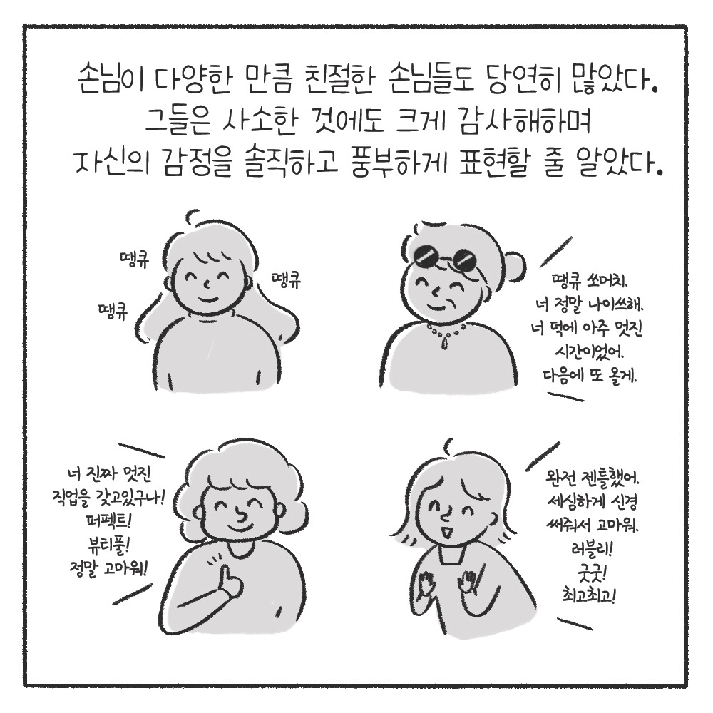 친절과 긍정적인 언어, 그리고 미소가 몸에 배어있는 사람들이 있다. 그리고 나는 이와 정반대인 사람이었다. 감정표현이 매우 단조로운 사람. 남에게 별 관심이 없는 타입. 그러다 보니 인간관계가 매우 서툴 수밖에 없었다. 누군가에게 칭찬하는 게 낯간지럽고 칭찬받는 법도 서툴러 누가 무슨 말을 하면 '아 정말? 그렇구나. 응. 아니. 몰라.' 무미건조한 대답이 전부였다.