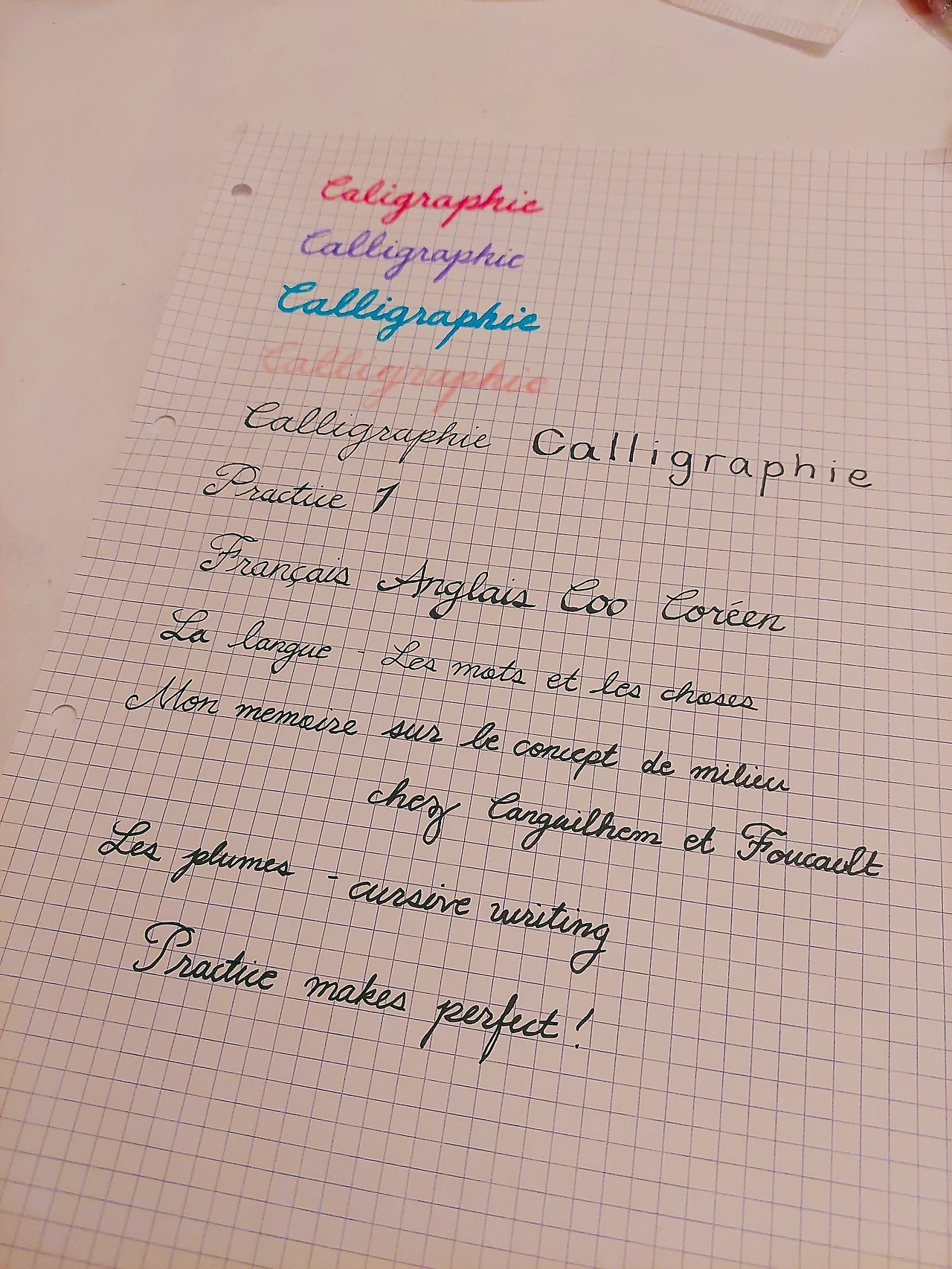 유튜브를 보면서 영어 필기체인줄만 알았던 것이 캘리그래피의 cursive writing이라는 것을 이제야 알게 되었다. 저 펜이 만년필인 줄 착각한 이유는 프랑스어 plume을 만년필로 생각 없이 외워서였다. 펜촉과 딥펜을 plume이라고 하고 만년필은 stylo-plume이라고 한다. 딥펜의 딥(dip)은 피자와 같이 배달 오는 갈릭 딥핑(dipping) 소스의 그 딥(dip)이다. 그래서 딥펜으로 글을 쓸 때는 잉크를 생각보다 자주 찍어주어야 한다. 귀찮은 일인 건 확실하다.