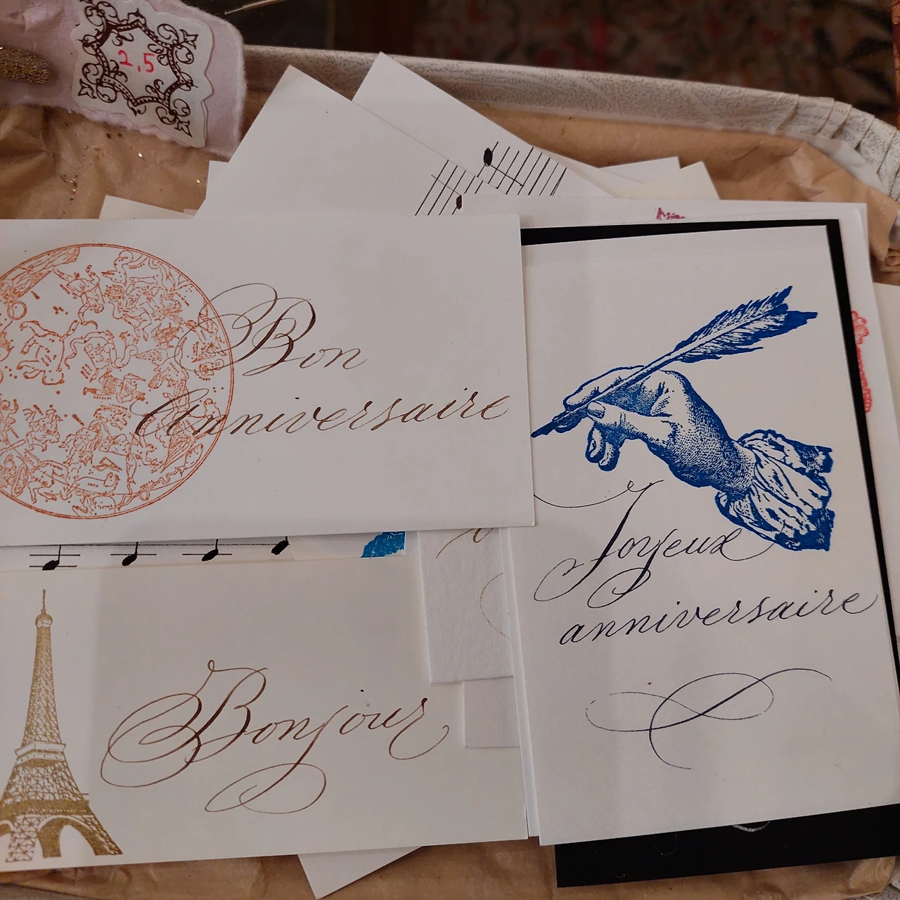 그리고 이 글씨를 나도 써보고 싶어서 금테를 두른 종이, 편지지, 붉은 양귀비가 그려진 종이 보관 봉투(내 것을 보고 다른 분이 예쁘다고 주인에게 보여달라고 한 후 사갔다) 가지각색의 종이와 펜촉과 잉크, 펜대를 한 아름 샀다. 그래서 하루 만에 가게 주인 분의 단골이자 귀요미(ma chérie)가 된 듯하다.