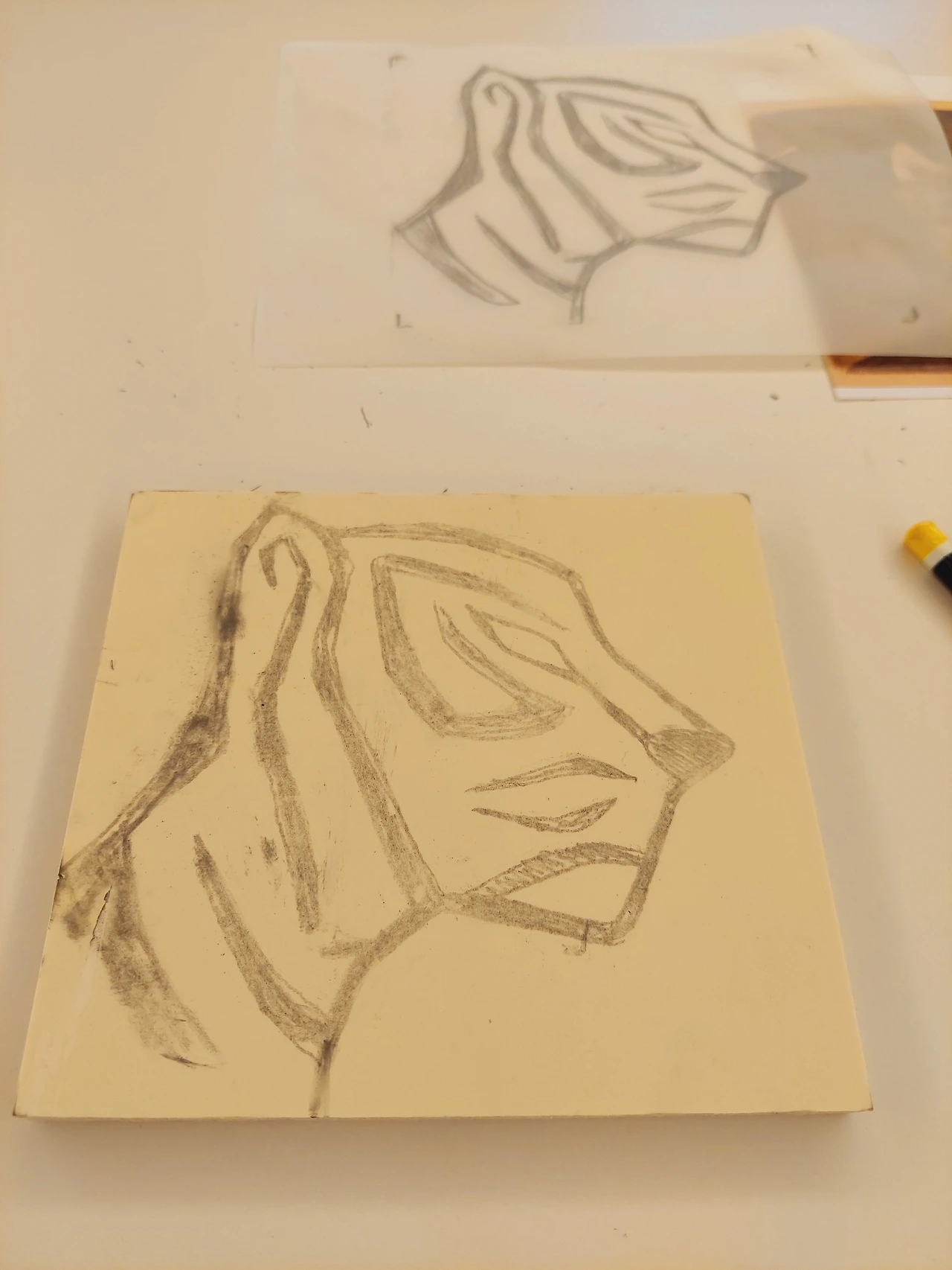 트레이싱지에 2B 연필로 호랑이 그림을 그리고 고무판에 크기와 형태를 맞추어서 트레이싱지를 골고루 문지르면 1단계는 끝이었다. 그림은 만족스러웠지만 시간이 늦어서 선생님이 염려한 이유를 잘 알 것 같았다. 대신에 도구를 가지고 빨리 호랑이의 몸과 얼굴의 덩어리를 파내었다. 이 부분은 빨간색으로 일차 인쇄를 할 것이었다. 도구와 방법도 설명을 들었는데 정확히 기억은 못하지만 대충 주의사항은 알아들은 것 같았다.