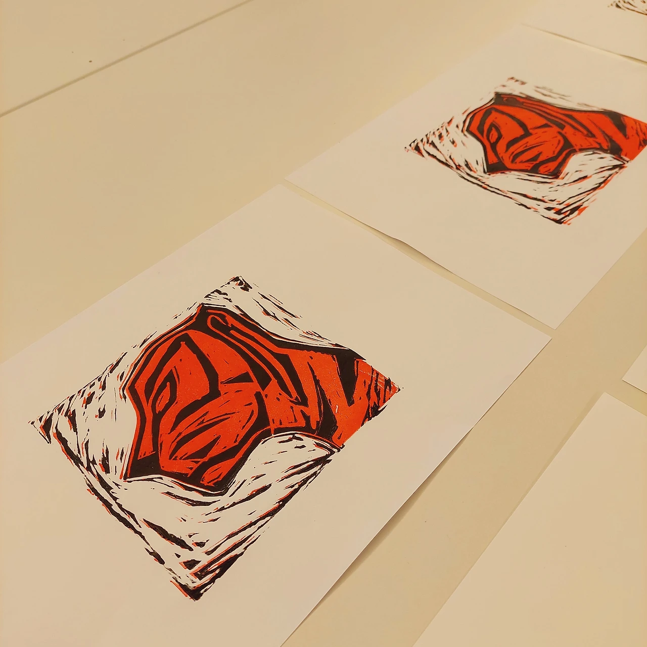 정해진 곳에 가서 두꺼운 도화지에 고무판을 맞추고 빨간 부분을 인쇄했다. 먼저 고무 가루가 묻지 않도록 깨끗이 먼지를 다 털고 물에 씻어내어 바닥에 빨간 잉크를 고르게 펴야 했다. 그다음에 고무판에 잉크가 고루 묻게끔 또 다른 도구로 종이 위를 고루 문질렀다. 사용법은 알지만 도구의 이름은 정확히 모른 채로였다. 빨간색 호랑이의 머리와 몸이 생각보다 더 잘 찍혀 나왔다.