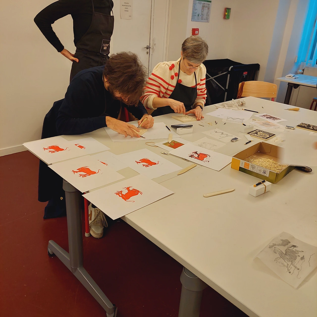 나는 처음 무언가를 시작하는 것을 매우 무서워해서 도서관 입구에 도착하기 전까지도 괜히 호기를 부려서 신청했다고 궁시렁거렸다. 입구 직원에게 물으니 판화 아틀리에 참가자들은 서점 앞에서 모인다고 안내를 해주었다. 아틀리에를 안내하는 사서 분은 도서관에 근무하는 대부분의 사람들이 그렇듯이 온화한 미소로 인사를 해주었다. 나는 참가자들 중에 유일하게 뚜렷이 외국인으로 보이는 사람이었다. 8명 중 동양인은 나뿐이었다.