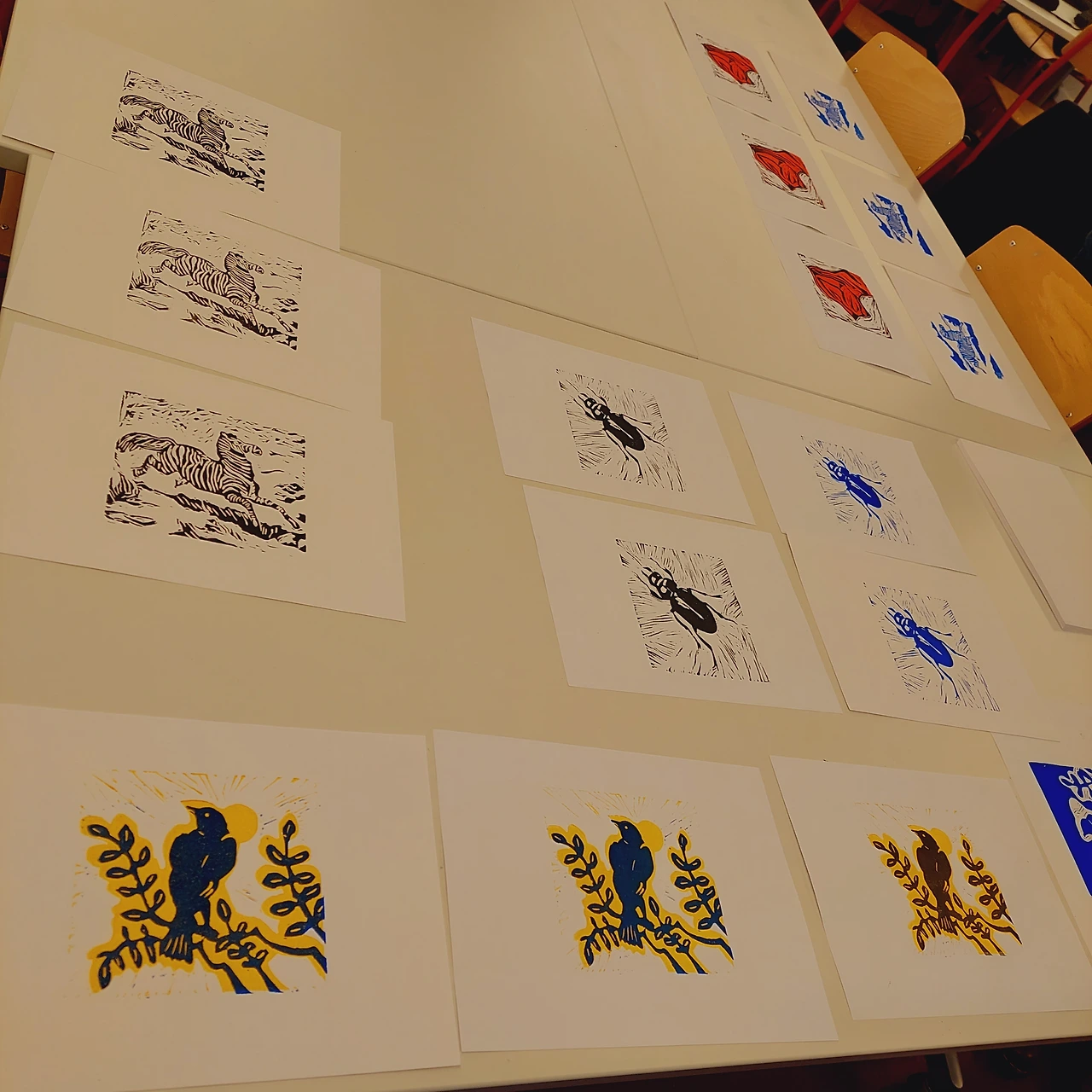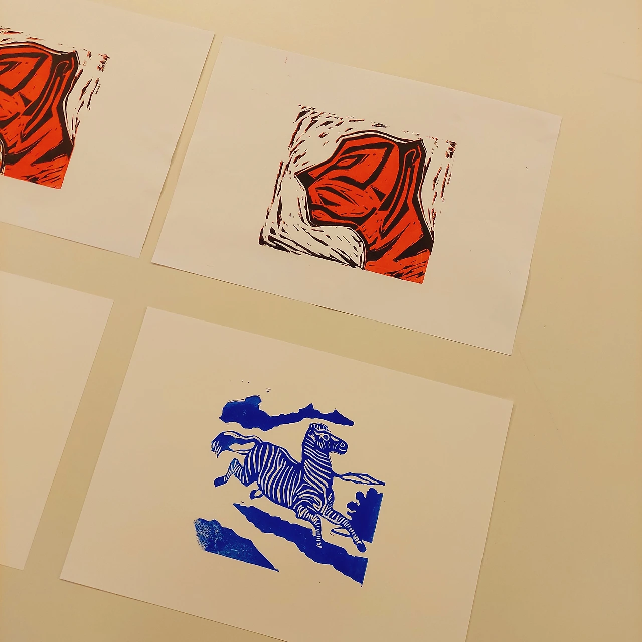 참가자들을 이끌고 사서는 도서관 직원들만 들어갈 수 있는 공간으로 우리를 안내했다. 프랑스어로 각 도구에 대한 설명과 해야 할 일을 이해하는 것은 생각보다는 무섭지 않았다. 우선 우리가 할 것은 고무판을 가지고 작업하는 것이다. 학교 다니면서 누구나 해볼 법한 지우개 파기와 크게 다르지 않았다. 사서는 견본 그림을 세 가지 정도 보여주었는데, 표범과 얼룩말, 그리고 나무 위에 올라간 새가 있었다. 판화는 단순히 한 가지 색깔로만 인쇄하는 것이 아니라 2도 인쇄처럼 모노타입(monotype)으로 인쇄하는 것도 있었는데 나는 호랑이를 주제로 해보고 싶었다. 빨간색으로 호랑이의 피부를 표현하고 검은색 선으로 굵게 호랑이의 얼굴과 줄무늬를 표현하면 꽤 멋지겠다는 생각이 들었다.