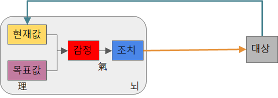 우리 선조들이 논쟁했던 이(理)와 기(氣)를 제어 틀속에서 대응시키면, 이는 목표값인 이상에 가깝고, 기는 행동인 감정에 가깝다. 이렇게 단순하게 설명하면 못마땅하게 여길 사람들이 있을 수 있고, 우리 선조들도 저를 나무랄 듯하지만 저는 수용하고 싶지 않다. 뭐 아직도 지구는 평평하다고 우기는 사람의 하소연 정도로 받아 줄 수는 있다.