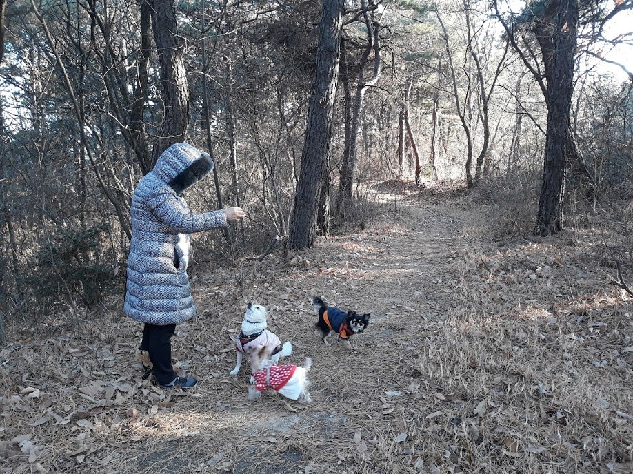 나는 아미와 감자를 몰고, 아내는 밤비를 끌고 가지만, 3마리가 냄새를 맡고 영역 표시하느라 앞뒤 좌우로 위치가 수시로 바뀐다. 이에 맞춰 줄이 꼬이지 않도록 자동 감김 릴을 재배치하고, 간혹 아내와 나도 위치를 바꾸어야 한다. 상당한 인지활동을 요한다. 주말에는 반석천 대신 뒷산에 오른다. 다행스럽게 인적이 드문 산길이라 목줄을 풀어놓을 수가 있어 3차 방정식을 푸는 노동에서 해방될 수는 있다.