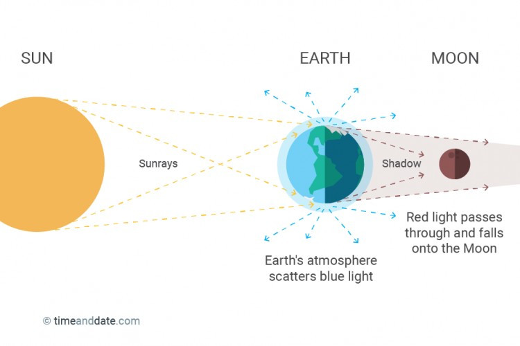 그래서 지구 그림자 속으로 들어간 달은 직접 햇볕을 못 받지만 그래도 산란된 붉은빛을 조금 받고 있다. 해가 서산 아래로 떨어져도 붉은 노을을 볼 수 있듯이, 지구 뒤편의 달이 노을빛으로 물든다고 생각하면 이해하기 쉽다.