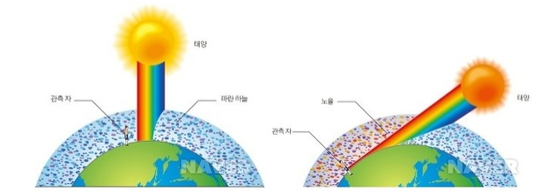 대기를 거의 직진하며 통과하는 붉은빛이 있고, 대기와 충돌하여 거의 되돌아 가는 파란빛이 있다. 둘 다 산란현상인데 붉은빛은 산란이 적고, 파란빛은 산란이 강하다고 표현한다.