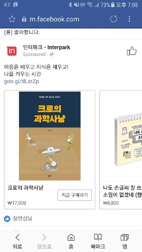 페북의 뉴스피드를 보다 깜짝 놀랐다. 인터파크가 내 책을 홍보하고 있었기 때문이다. 별의별 생각이 머리를 스치고 지나갔다. 페북에서 광고를 본 적이 있었지만 내 책이 광고로 나오리라곤 꿈에서도 생각한 적이 없었다.