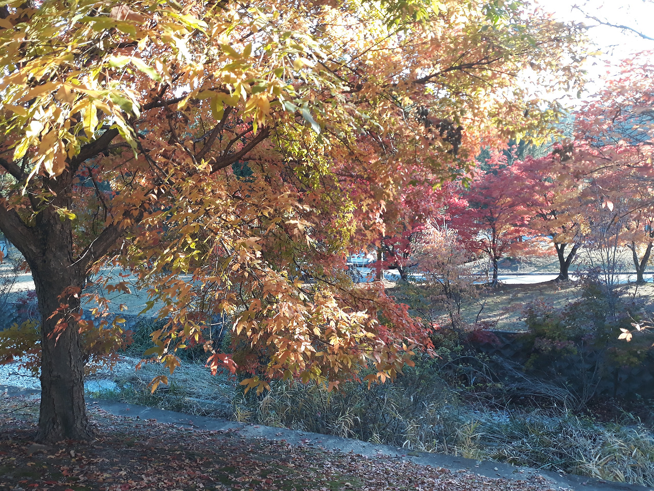 점심으로 김밥을 주문했으니 찾아오라는 아내의 요청으로 차를 끌고 교회로 갔다. 반석천과 은구비 공원에는 색의 향연이었다. 매달린 단풍을 보며 즐거워하다가도, 떨어진 낙엽을 보며 아쉬워했다. 공원 근처 학교 후문에 틈을 삐집고 들어가 차를 세웠다. 이제 막 예배가 끝났는지 한 무리의 사람들이 지나갔다.