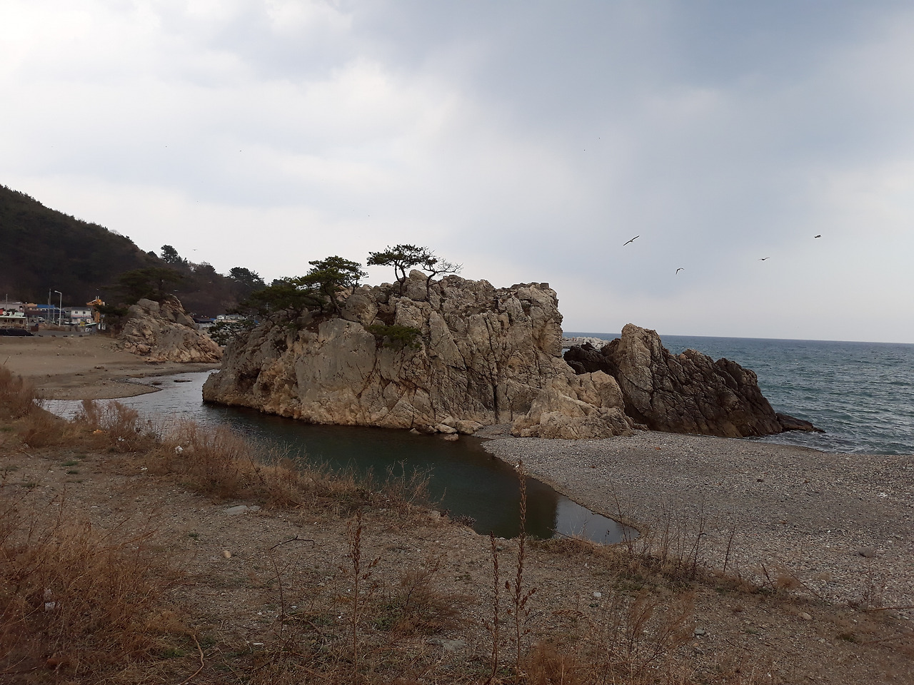 한반도 지형의 토끼 꼬리에 해당하는 구룡포를 도착지로 설정했다. 바다 풍경이 좋은 곳에는 어김없이 모텔, 펜션, 식당 들어서 있지만 몇 달째 인적이 없었는지 바람에 날린 비닐이 널브러져 있었다. 모퉁이를 돌 때마다 새로운 기대를 하지만 문 닫힌 식당과 말라버린 잡초로 우거진 밭만이 나를 맞이한다. 얼마 가지 않아 아름다운 마을을 보리라는 기대마저도 접는다. 구룡포도 집으로 가는 길에 있다는 자기 합리화를 한다. 확 트인 해수욕장이 간혹 나타나고, 양지바른 절개지에는 막 봉우리를 내민 진달래가 그나마 위안이 되었다.