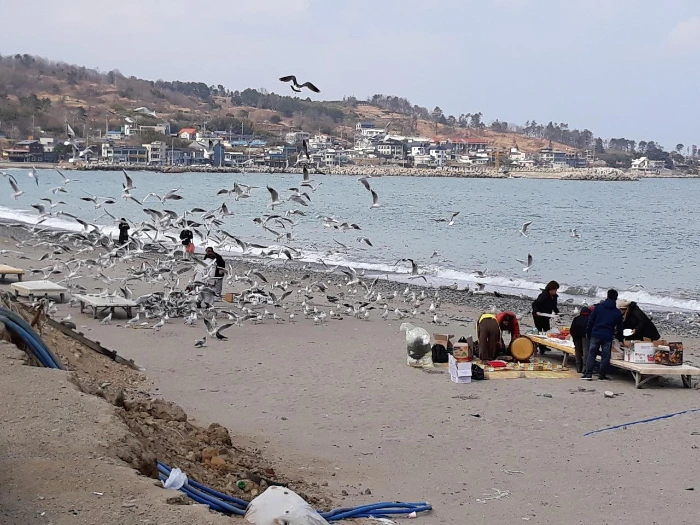 발전소 후문의 양북면에는 문무대왕암이 있다. 수없이 지나갔지만 차를 내려 가까이 가본 적은 없다. 죽어서도 왜구를 물리치겠다는 문무왕의 충정을 느끼고자 다가갔지만, 살아서 부귀영화를 누리겠다는 굿판에 실망하여 나는 서둘러 자리를 떴다. 북소리와 향냄새로 정신이 어지러운데 굿판에서 음식 한 조작 얻어먹으려는 갈매기 군무마저 나를 심란하게 한다.