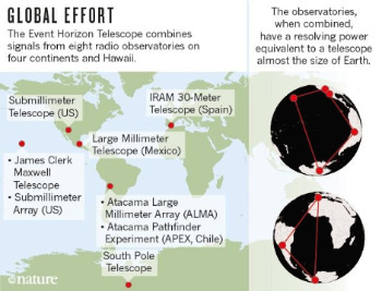 별에서 나오는 빛의 파장이 λ이고 수신기의 반경이 D이면 전파 망원경의 분해능은 λ/D에 비례한다. 즉 수신기 반경이 클수록 고해상도의 영상을 얻을 수 있다. 만일 전파망원경을 지구 곳곳에 설치하면 지구의 반경만큼 큰 전파망원경을 얻을 수가 있다. 이번 블랙홀 관측에는 남반구의 여러 전파망원경을 연결하여 사용했다.