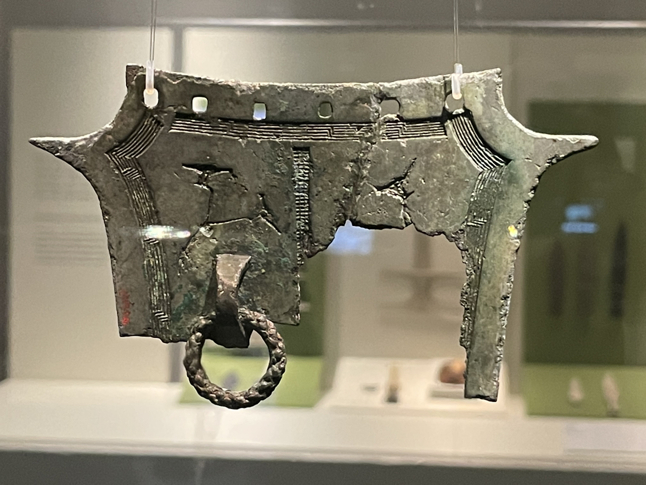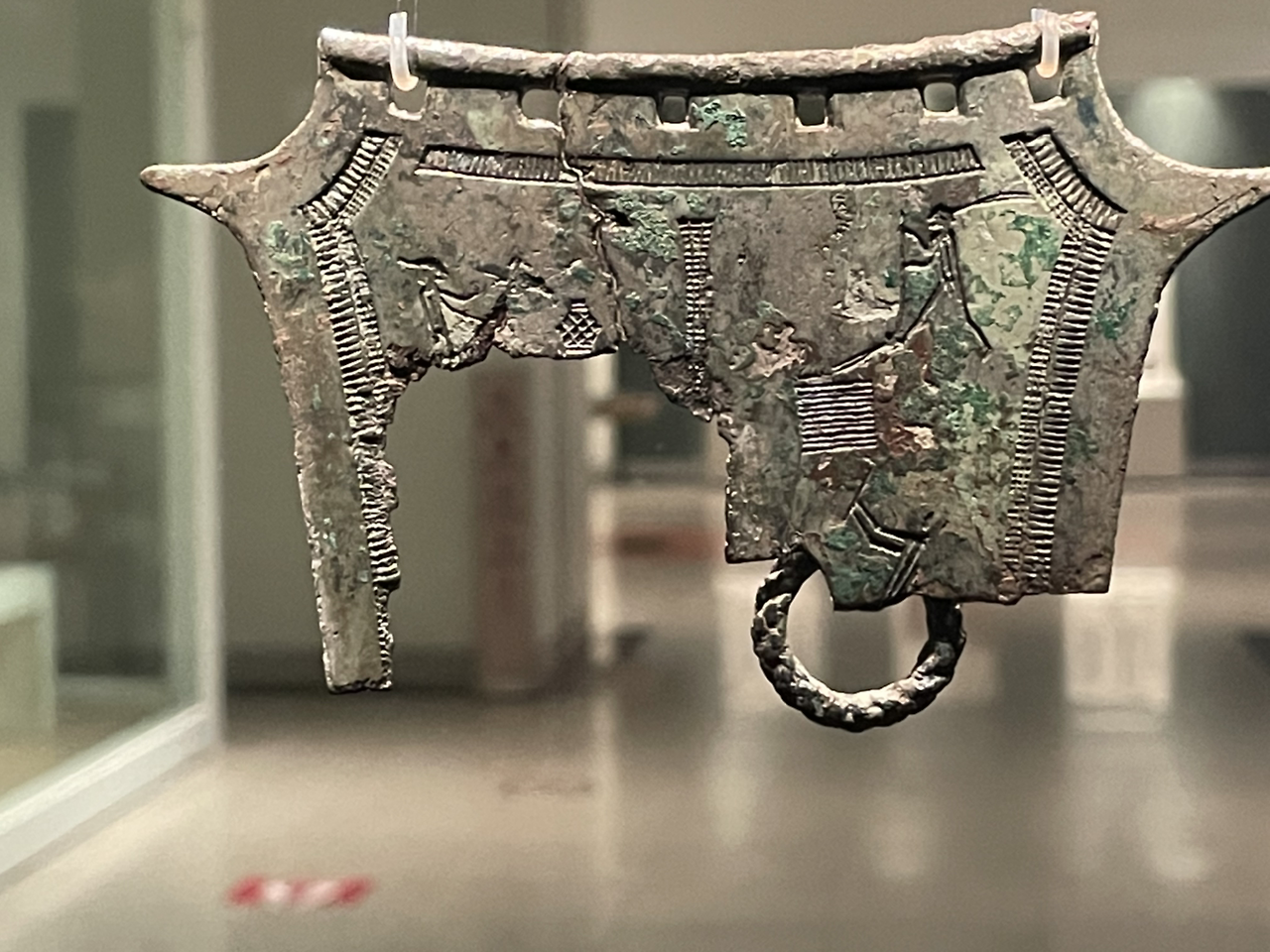 농경문 청동기가 특히 주목받는 것은 그 표면에 새겨진 그림 때문입니다. 마을 경계를 나타내는 솟대, 농기구를 들고 농사를 짓는 벌거벗은 사람들, 밭을 나타내는 그림, 곡식을 저장하던 토기.. 등이 나타나서 이 청동기는 풍년을 기원하는 제례의식의 도구로 사용되다가, 이것을 사용하던 의식의 주관자 (아마 지배자나 신관)가 죽은 뒤에 같이 매장이 된 것으로 여겨집니다. 한반도에서 농경이 시작된 것은 신석기 시대인 기원전 30세기경.. (청동기 시대 이전부터) 이라고 하니까. 지금으로부터 약 5000년쯤 전으로 예측하고 있습니다. 농경문화가 시작되면서 인류의 정착생활이 시작되었고 소유와 계급이 출현하게 되었습니다. 국가의 핵심적인 경제활동이었던 농사는 조선시대까지 국왕이 농사를 직접 장려하기 위한 친경제를 직접 행하는 것이나 궁궐안에 내농포를 두어서 농사를 짓는 등. 선농의식을 가지고 우대해 왔습니다. 요즘 대통령들은 주로 공장이나 연구실을 방문해서 경제활동에 대한 정치권의 관심도를 나타냅니다만, 예전 박정희 대통령 시절만 해도 자주 논에서 농사꾼들과 같이 일하는 모습으로 지배계급의 경제활동에 관심의 정도를 나타내었습니다. 박정희 대통령 당신이 농사꾼 출신이기도 했구요. 박정희 대통령이 소매 걷어부치고 농사를 짓던 모습이나 정주영 현대회장이 목장에서 소를 키우고 간척지를 농경지로 바꾸는 일을 했던 것도 우리가 얼마나 오랫동안 농경문화속에서 살아왔는가를 이야기해 주는 일화입니다. 이 장신구는 이 같은 한반도 농경문화의 장구한 역사와 경제활동에 대한 지배자의 제례적. 혹은 주술적 역할을 상징합니다.”