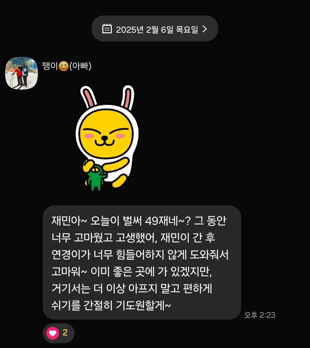 아빠는 아직 귀국을 못한 탓에 오빠의 49재에 참석을 하지 못했는데 오빠와 함께 있는 단톡방에 보낸 메세지를 보고 한참을 울었다.