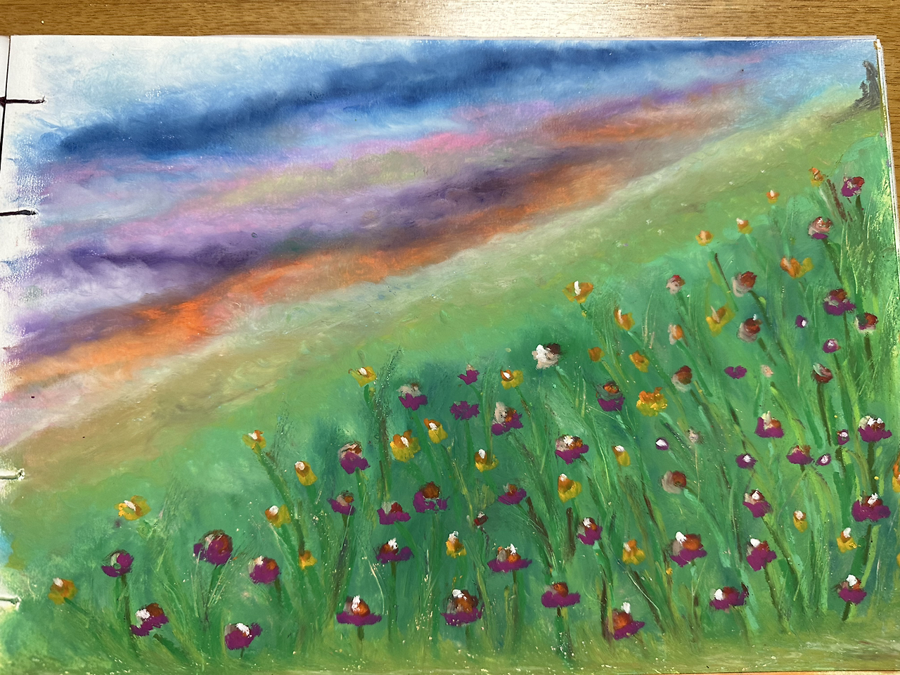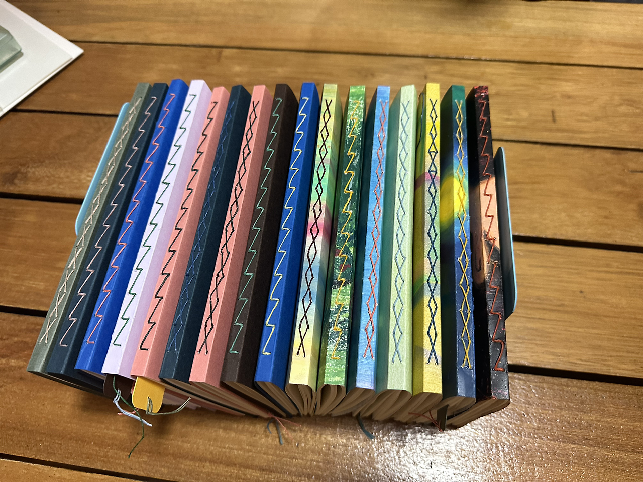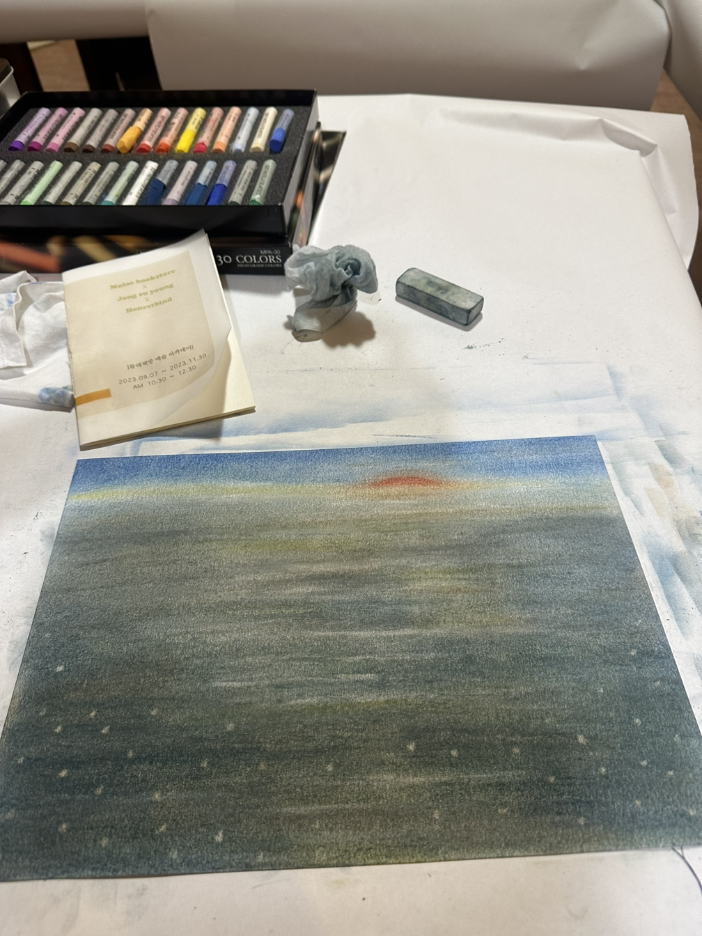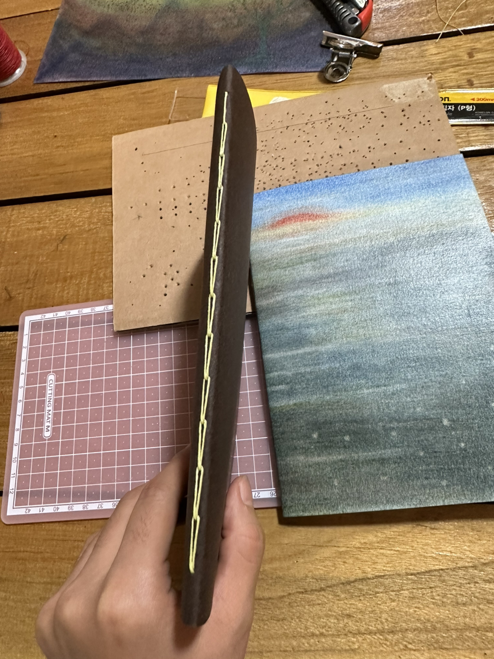 10월부터 이어나간 ‘드로잉&북바인딩’ 수업으로 소프트 파스텔, 오일 파스텔로 그림도 그리고, 노트도 만들었다. 고상한 취미라고 여길 수 있겠지만 작업하는 동안 손으로 혹은 도구로 열심히 문지르고, 어느 정도 힘 조절이 필요한 바느질도 묵묵히 해야 했다. 그 가운데 노동요는 빠질 수 없는 중요한 요소가 되었다. 그 과정이 지나면 수줍은 완성품이 나온다. 수업이 끝나면 내 안의 모든 지방이 사라지는 듯한 허기는 바로 이러한 과정의 이유이기도 했다. 개개인이 수고스러움을 견디고, 노동을 해야 탄생되는 작품들은 하나같이 셀렘과 정성과 사랑이 느껴졌다.