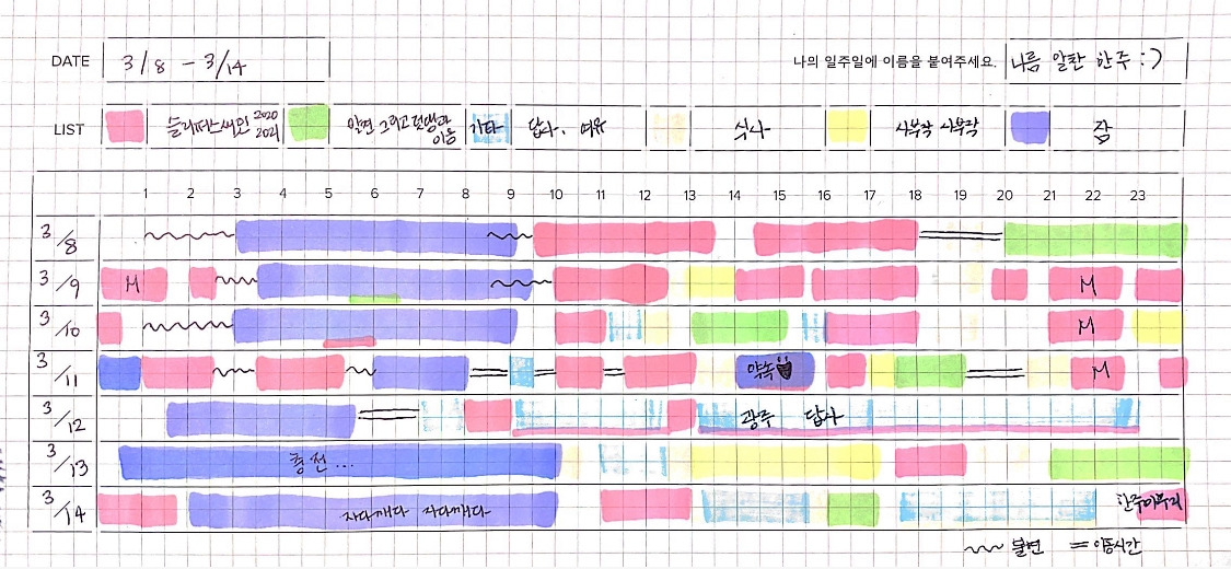 이 책에서 작가님이 제안하는 가이드라인을 따라서 나의 일과들을 채색해보고 돌아보면서 나를 발견해 나갔다. 내가 좋아하는 휴식은 무엇인지, 내가 실천하지 못하고 미루고 있는 것들은 무엇이 있는지, 그리고 깨달았다.