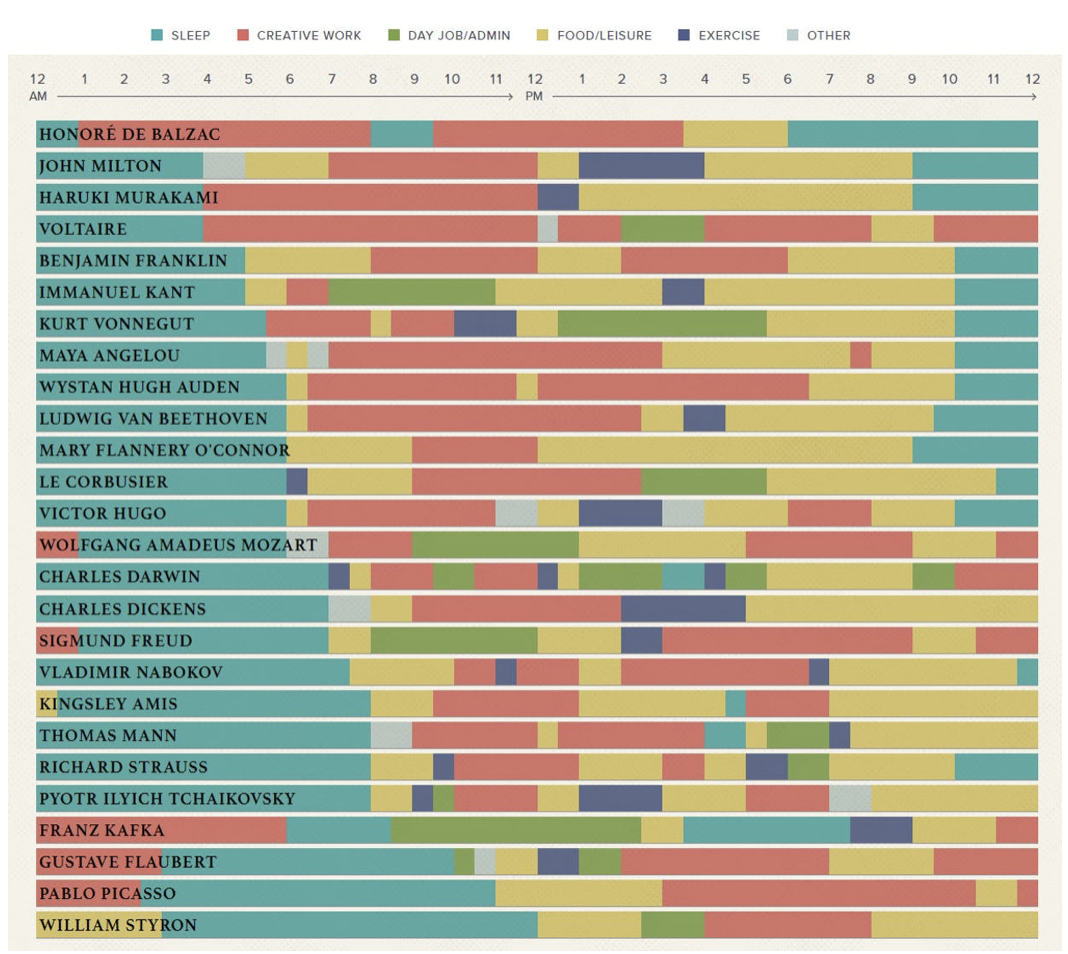 유보라 작가님은 인터넷 서핑을 하던 중 이름을 들으면 알 법한 세계적인 아티스트들과 인물들의 일과가 다양한 색으로 정리된 차트를 발견했다고 한다. 그들의 시간들 중에는 창작활동이 아닌 일상적인 일, 여가, 운동에 할애된 시간들도 다수 포함되어있다. 유보라 작가님은 아티스트들의 일상에 대한 컬러링 차트를 보고 그들의 일상에 대해 알아가던 중 그들도 우리와 같이 집중이 어려운 날들이 있었으며, 게으르게 보냈던 나날들도 있었고, 자신의 마음처럼 움직이지 않았던 날들도 있었다는 것을 알게 되었다고 한다.