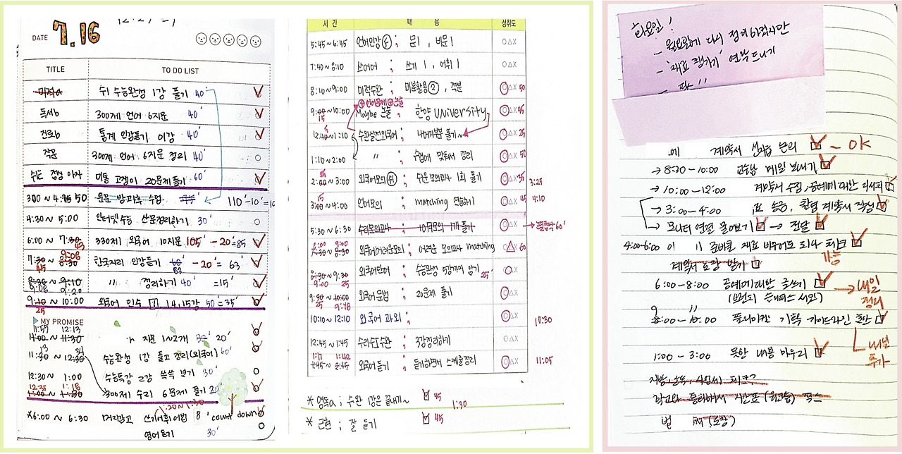 개인적으로 나는 학창 시절부터 내가 지내게 될 다음날의 일정들을 10분 단위까지도 쪼개서 적어놓곤 했다. 지금 그때를 돌아보면, 잠들기 전에 미리 다음날의 계획을 치밀하게 세워두기 위한 훈련을 굉장히 많이 했던 듯하다. 한국의 입시에서 살아남기 위한 전략으로 나는 내가 사용할 수 있는 모든 시간들을 통제하는 방법을 습관으로 만들었던 것이다.