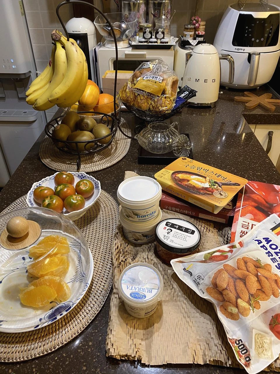 공용 시설에 도착하자 마켓 컬리 택배가 보인다. 택배를 들고 다시 집으로 올라온다. 가족들이 깰까 조심조심 문을 열고 엄마와 나는 살금살금 주방으로 향한다. 속닥속닥 이야기를 누며 엄마가 무엇을 주문하셨는지 하나하나 꺼내보는 우리가 참 귀엽다. 이번엔 부라타 치즈들과 모차렐라 치즈 튀김, 멍게 무침, 함박스테이크 등을 주문하셨단다.