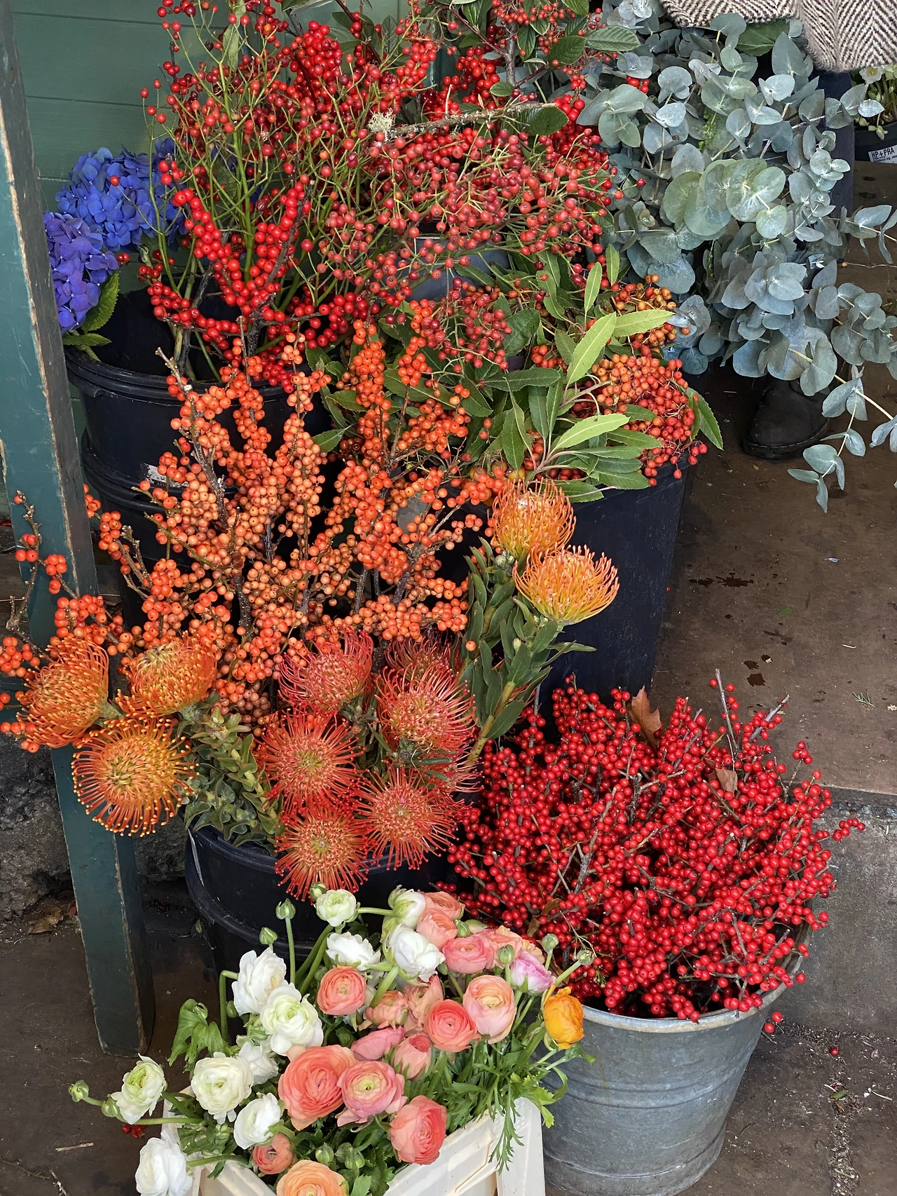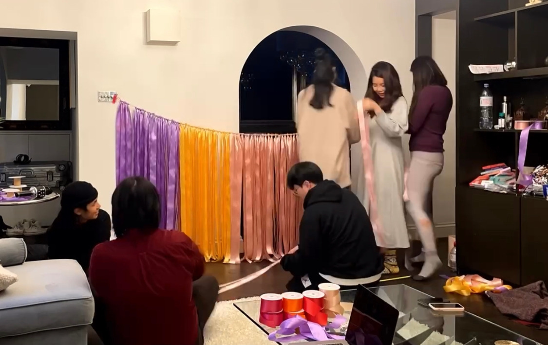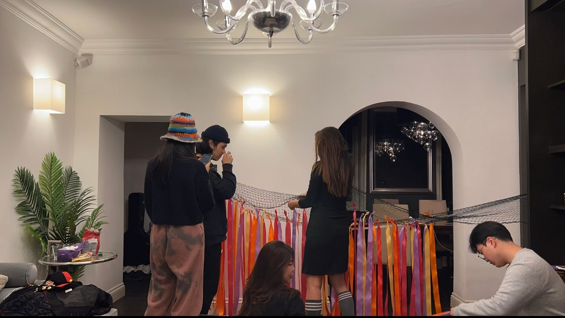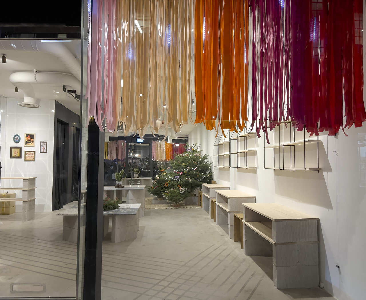 팝업의 설치 직전까지 승민 큐레이터님과 나는 오고 가며 스치는 모든 리테일 샵들의 크리스마스 장식들을 계속해서 자세히 들여다보고 여러 플라워샵 들을 방문하였다. 그리고 우리의 리본 스트리머와 트리 장식의 형태가 어떻게 제작되어야 할지 고민했다. 여러 가지 예시들도 찾아 고민해보고 테스트 겸 모두 모여 한쪽을 제작해보면서 최종 형태를 결정하였다. 그 후, 하루는 날을 잡고 모두가 다시 모여 옹기종기 앉아 리본을 자르고 묶으며 장식을 완성하였다. 조금 성가신 부분이 없잖아 있었지만 하나하나 함께 완성해 나가는 순간들이 재미있었고 꼼지락꼼지락 손을 써서 무언가를 만들 때 느껴지는 몰입감도 좋았다.