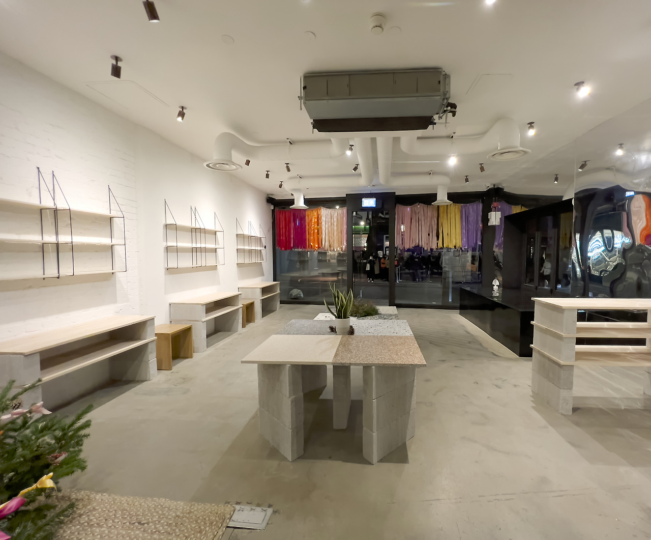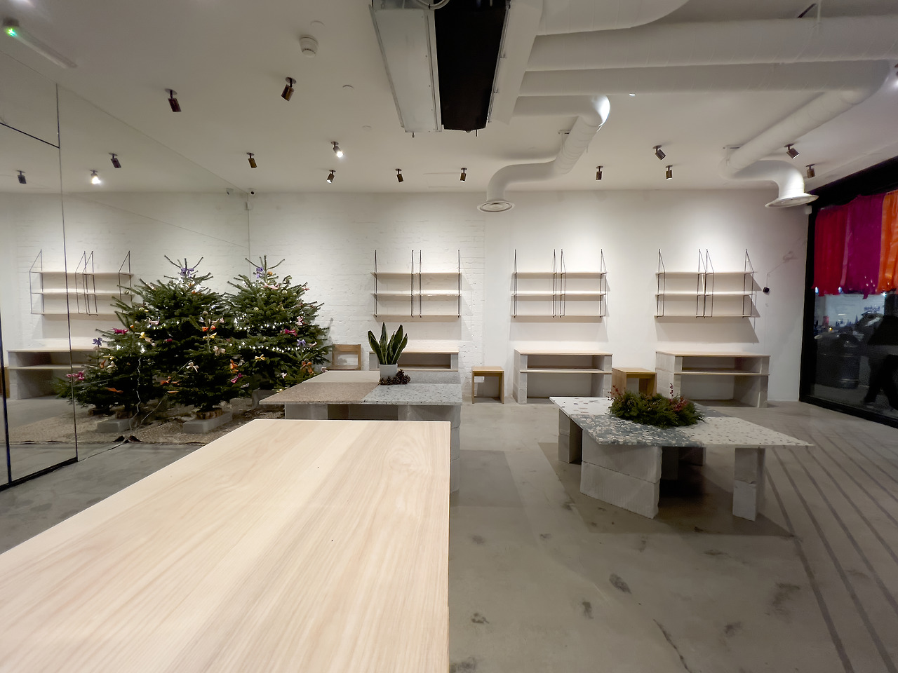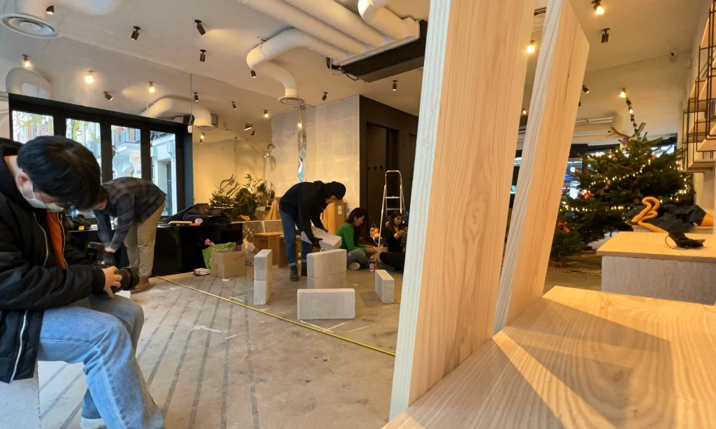 그리고 그 결과, 방문객들이 시각적 부담감 없이 편안하게 제품을 둘러볼 수 있도록 목재료와 대리석을 활용한 자연적이면서 크리스마스 시즌인 만큼 포근한 분위기를 낼 수 있는 공간으로 디자인 방향성을 잡았다. 특히 팝업 스토어 철거 후, 폐기물들을 최소화하기 위하여 모든 재료들의 재사용 및 재활용 아이디어를 고려하였으며 그에 적합한 현지의 목재료, 대리석, 벽돌 등 원재료를 내부적으로 논의 후 두 건축가가 직접 공수하였다.