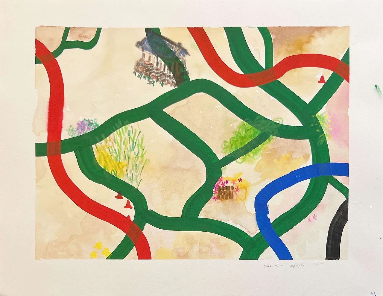 자신을 차분히 내려다보았다면 이제 지나온 여정을 돌아보며 그 여정이 마음에 남긴 길들을 떠올려 본다. 작가님은 빨간색, 파란색, 초록색, 검은색 선으로 구성된 ‘마음지도'라는 자신만의 작품 형태를 이어오고 있는데, 이 ‘돌아보기' 라는 이름의 작품은 나의 지난날들을 돌아본 것을 ‘돌아가는’ 형태의 마음지도에 표현해 둔 것이 참 재밌다. 그녀는 지나온 과거에 기억하고 싶은 좋은 것들도 많지만 ‘상흔’을 자주 마주하게 된다고 말한다. 마음에 있는 상처를 입었던 자리에 남은 흔적도 길이 되고 그게 깊어지기도 하고 얕아지기도 하는 게 진짜 대지 위에 길이 나는 것과 닮았다는 생각을 들게 한다.