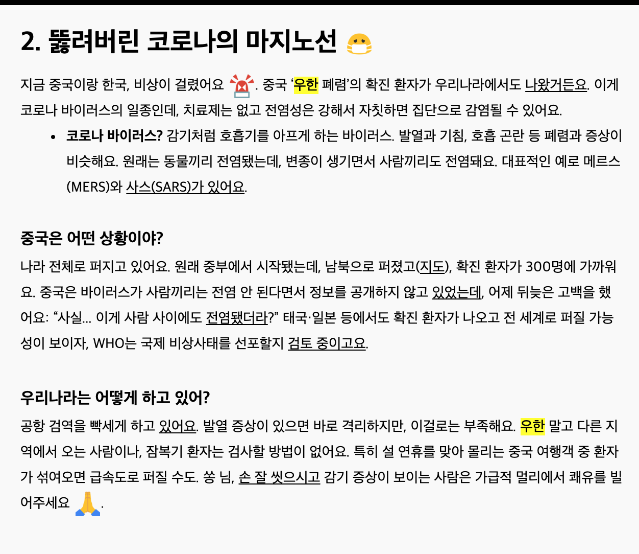 코로나19에 대해 처음 알게 된 건 설 이전이었다. 뉴스를 다루는 직업을 가진지라, 여러 외신을 두루 살피는 것이 일과이다. 그런데 어느 날부터 SCMP가 중국 우한 지역에서 발생한 ‘정체불명의 폐렴’에 대한 기사를 지속해서 다루기 시작했다. 첫 번째 기사는 그냥 넘겼다. 두 번째도 마찬가지였다. 그런데 세 번째, 네 번째… 우한 폐렴은 이제 우한에만 머물지도, 폐렴에만 국한되지도 않았다. SCMP는 이미 ‘사스’를 언급하고 있었다. 전 세계 언론이 고요한 가운데 중국만 유독 소란스러웠다. SCMP의 조심스러운 추측을 독자에게 전한 날, “추측을 너무 사실인 것처럼 전해 불안감을 조성한다”는 부정적인 피드백을 받았다.