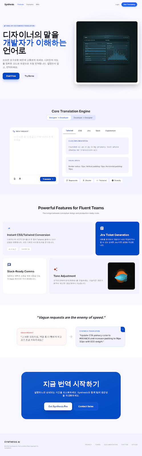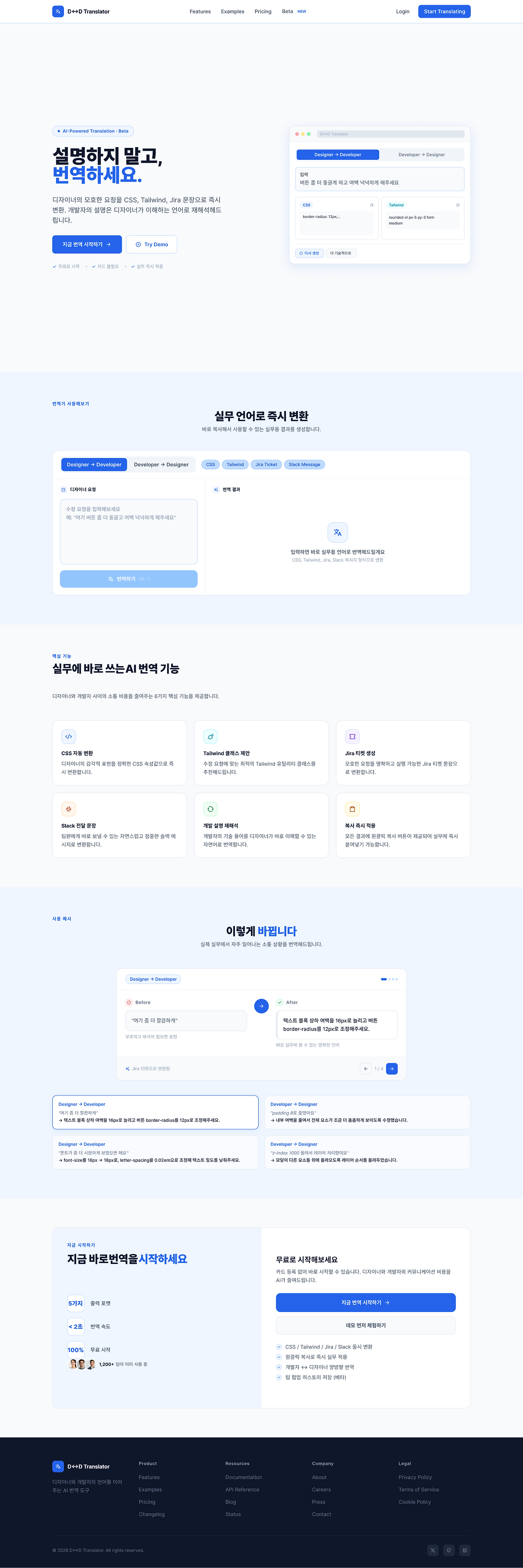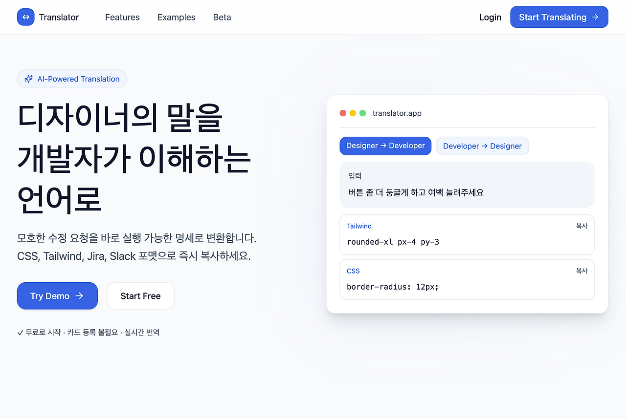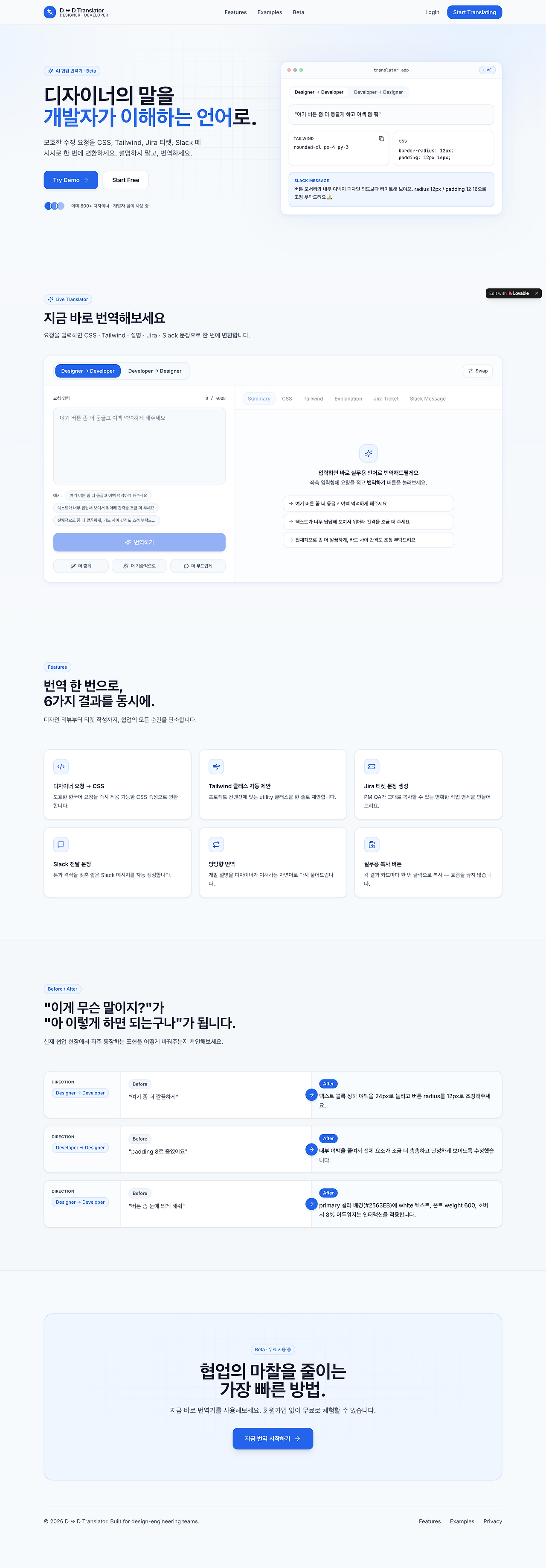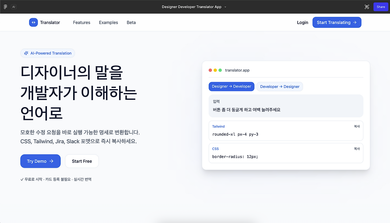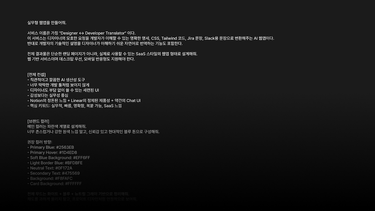 재미있는 아이디어가 하나 떠올라서 프롬프트로 만들어봤다. "디자이너와 개발자 사이의 번역기" 라는 가상의 SaaS 서비스.