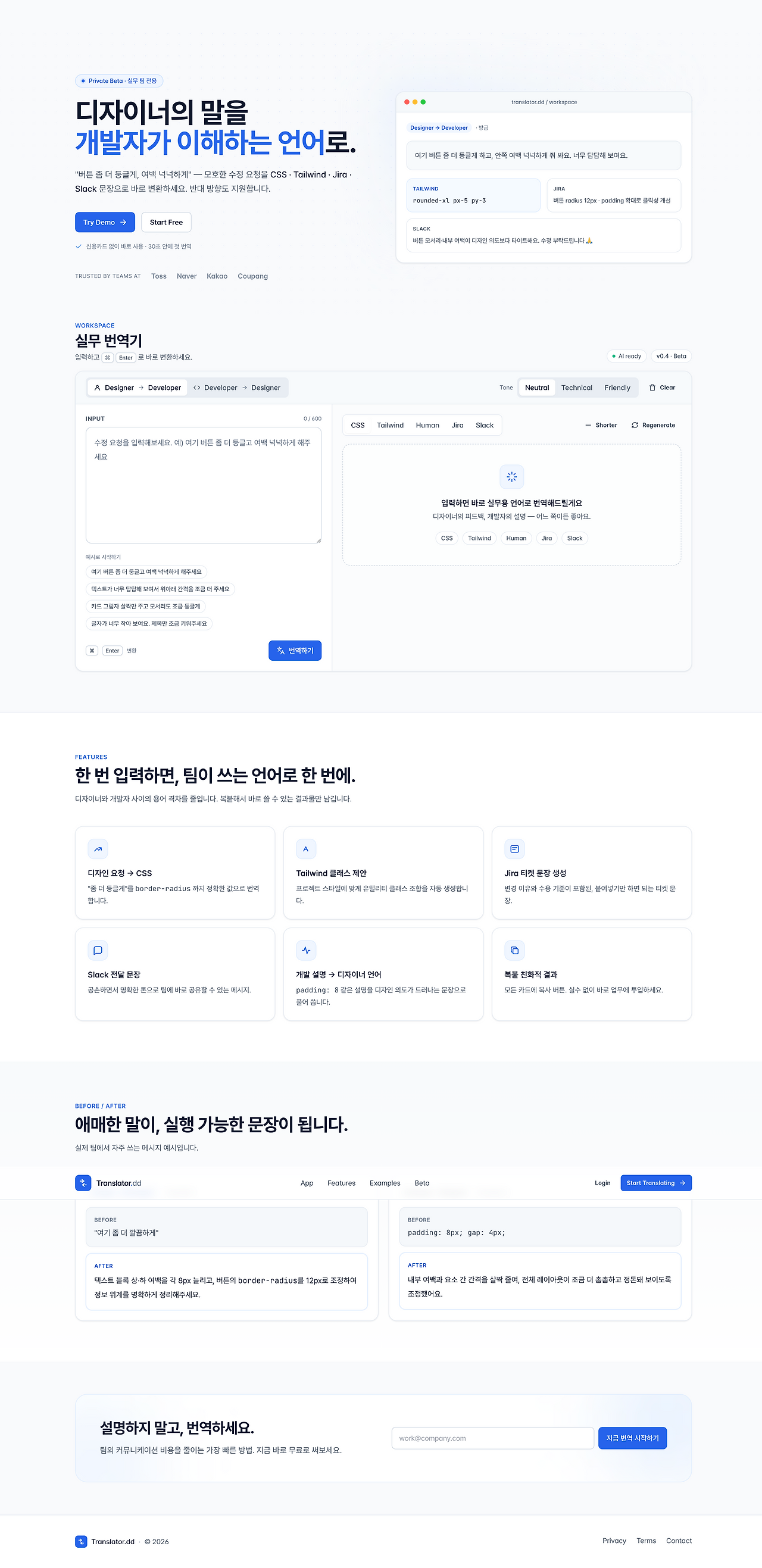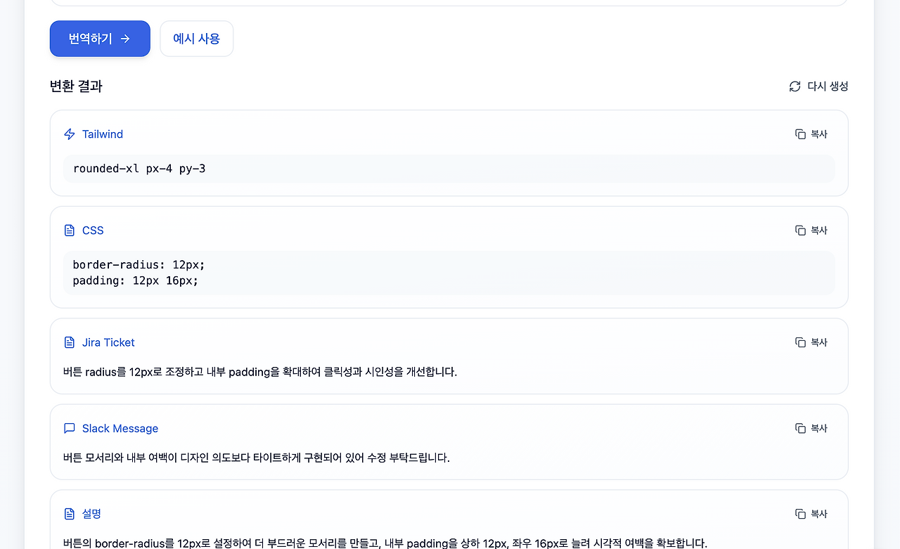 디자이너가 "여기 좀 더 깔끔하게요"라고 하면, CSS, Tailwind, Jira 티켓, Slack 메시지로 변환해주는 웹앱이다. 반대 방향 번역도 된다.