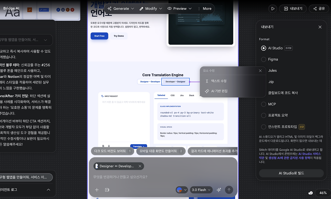 화면 오른쪽 내보내기 패널을 열어보면 선택지가 8개나 된다. 원하는 다음 작업에 따라 꺼내갈 수 있다는 뜻이다. 디자이너면 Figma, 개발자 넘길 거면 .zip이나 코드 복사, 프로토타입 보여줄 거면 바로 링크. 앞서 본 lovable이 피그마로 못 옮겨와서 답답했던 것과 비교하면 훨씬 자유롭다.