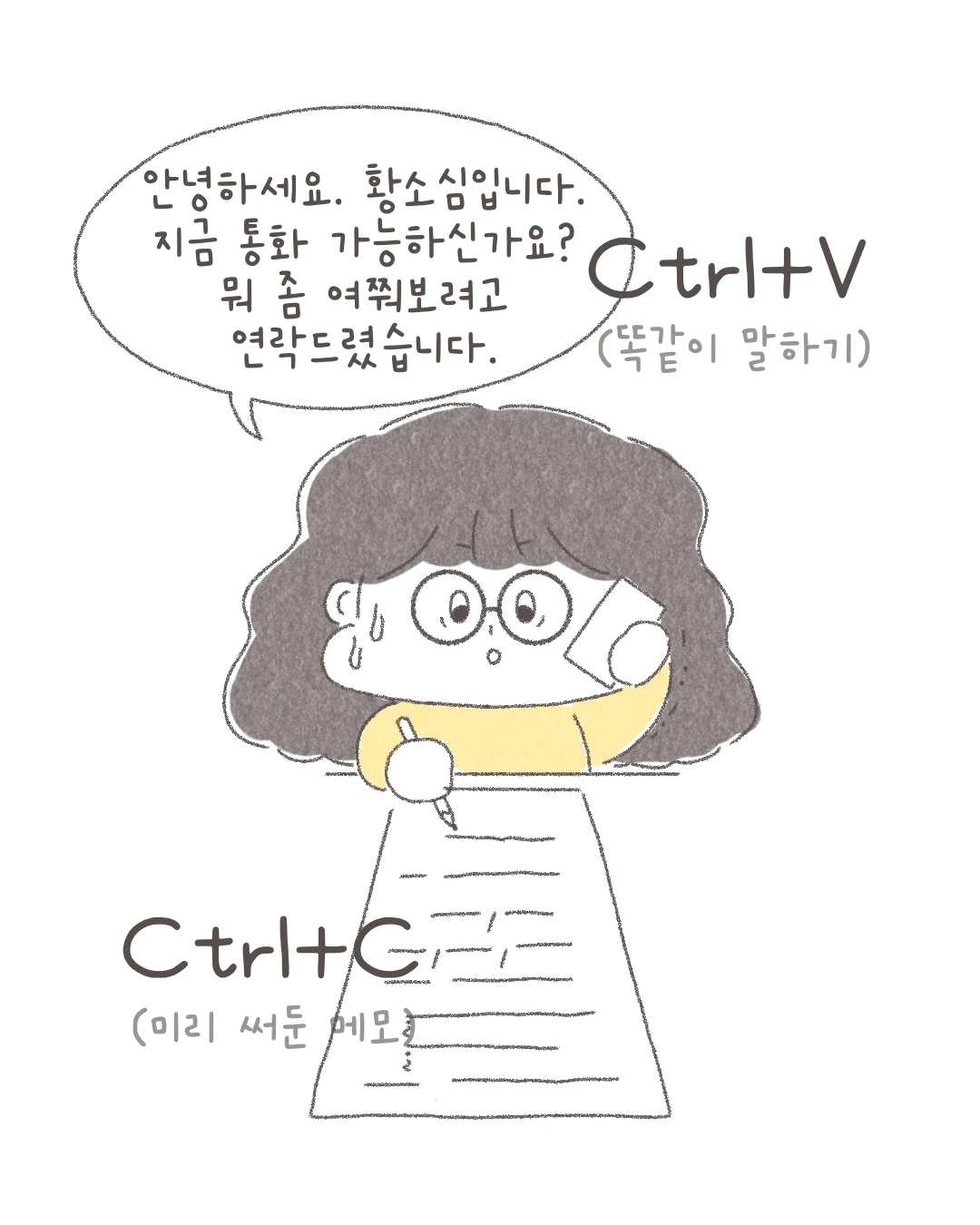 콜 포비아를 극복하기 위해 생긴, 작은 의식 같은 습관이 하나 생겼다. 바로 ‘전화하기 전, 할 말 모두 적어 두기’이다. 책상 앞에 앉아 메모장과 펜을 꺼내 꼭 해야 하는 말들을 차근차근 적어본다. 나만의 대본이 생기면 횡설수설할지도 모른다는 두려움을 한결 가볍게 만들 수 있다. 그리고 통화 버튼을 누르기 직전, 크게 심호흡을 한 번 하면 마음이 한결 편해진다.