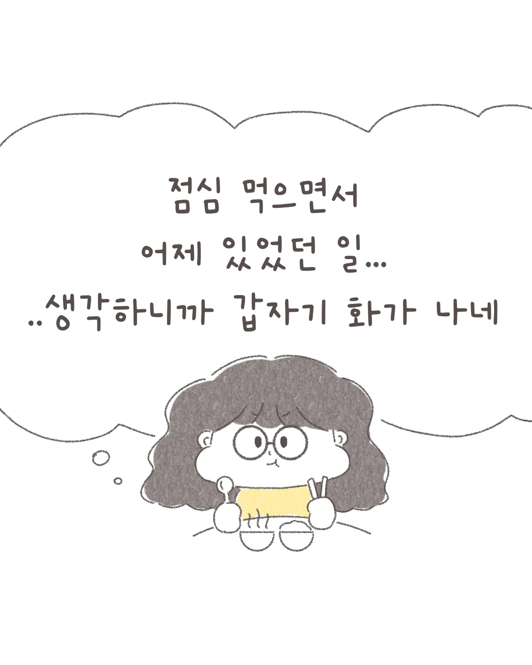 점심을 먹는다. 주변의 웅성거리는 소리에서 어제 일과 관련된 단어를 듣자마자 다시 생각 스위치가 켜진다. 그때부터 다시 빠져나올 수 없는 생각의 늪으로 빠진다. 어제 있었던 일을 생각하며 마음속으로 소심하게 화를 내본다.