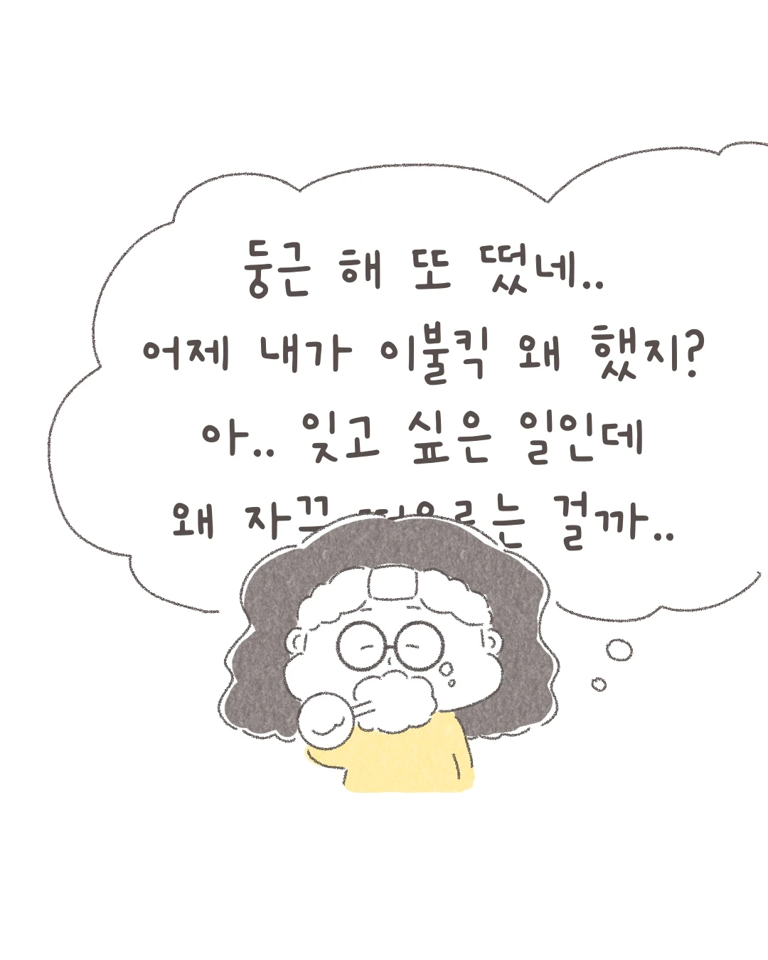 불현듯 떠오른 흑역사에 잠시 양치질을 멈춘다. 나는 왜 이불만 덮으면 이미 오래전 일인 데다 잊고 싶은 일이 눈앞에 떠오를까. 그냥 아무 생각 말고 양치나 열심히 할걸. 괜히 생각했다고 후회해 보지만 이미 늦었다. 소심이 모드가 켜졌다.
