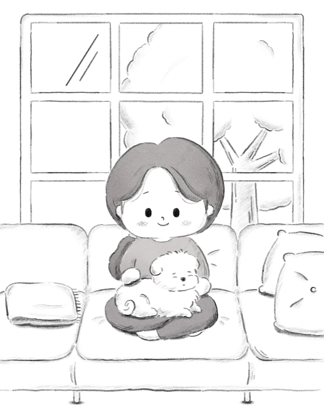문을 열자 중문 너머로 처음 보는 하얀 솜뭉치가 또르르 달려왔다. 순간 나는 다른 집에 잘못 들어갔나 생각했다. 어리둥절한 표정을 지으며 문을 여니 솜뭉치가 내 옆에 찰싹 붙어 따라왔다. 거실 소파에 앉은 엄마가 우리를 바라보며 즐거운 표정을 짓고 계셨다. “엄마, 이 강아지 뭐야?”라고 물으며 솜뭉치와 눈높이를 맞추니 호기심 가득한 눈으로 나의 머리카락을 냠냠 맛있게 뜯으며 반겼다.