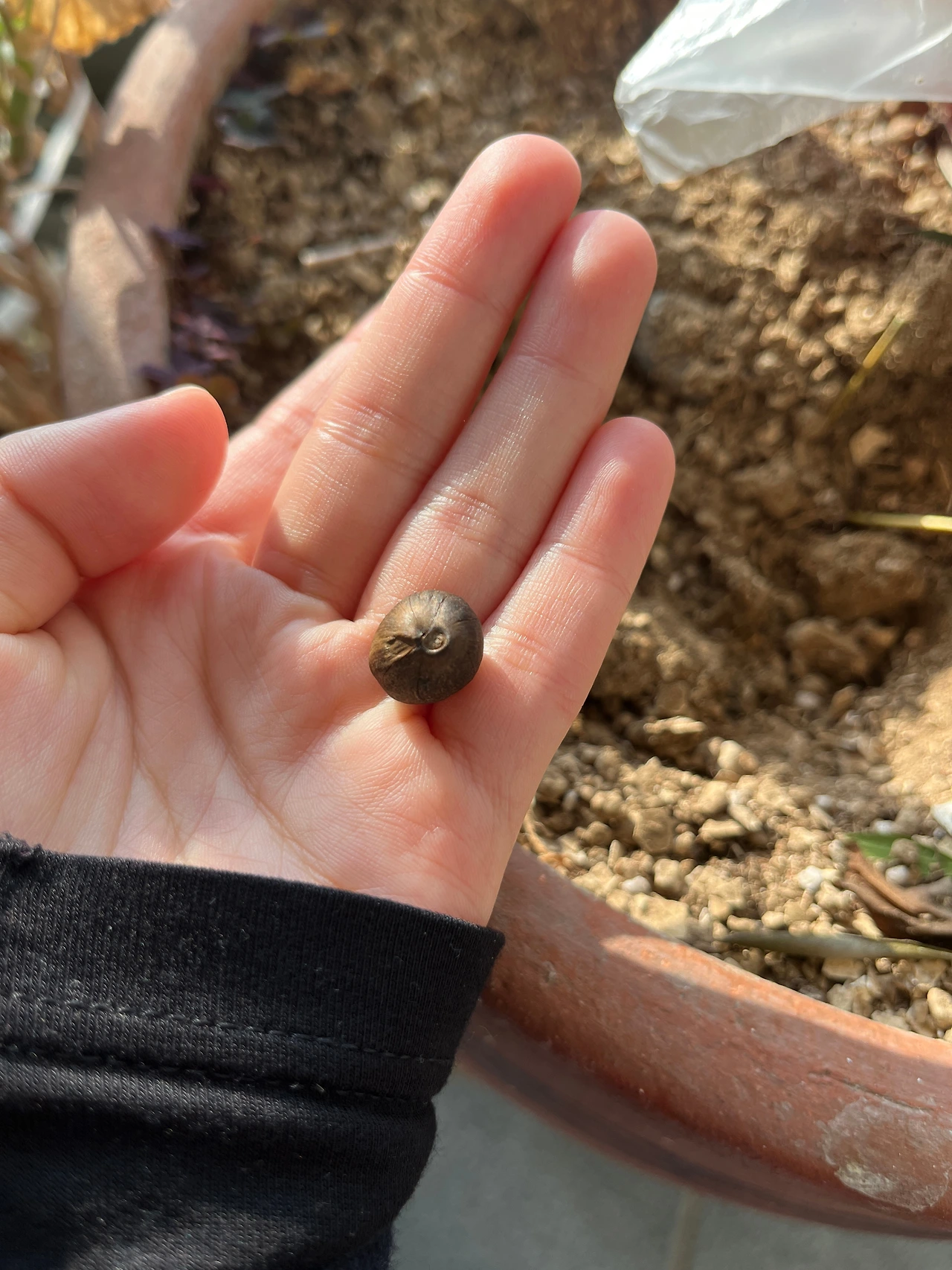 벌어진 틈 사이로 작은 알맹이가 톡, 하고 떨어졌다.