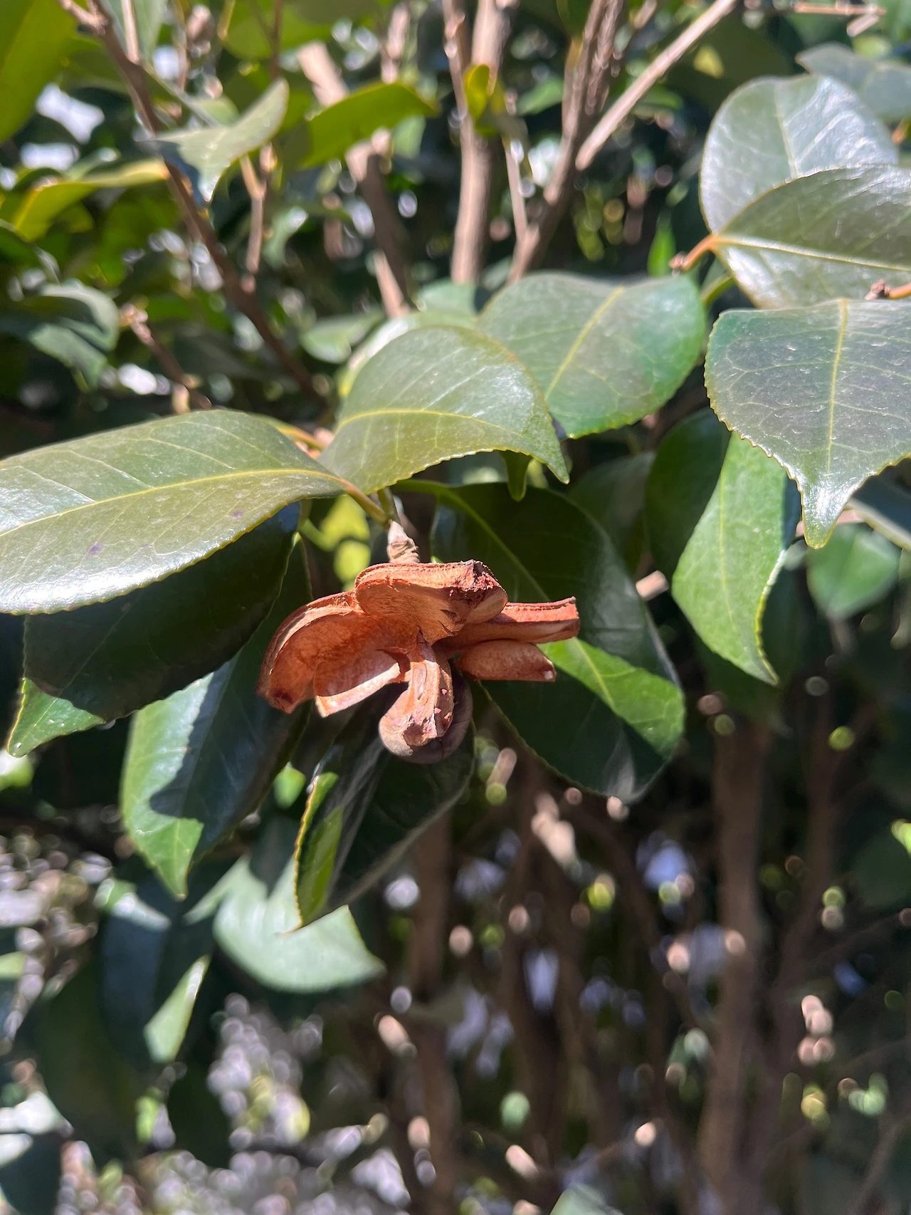 그 동백나무에서 벌어진 큰 열매 하나를 발견했다.