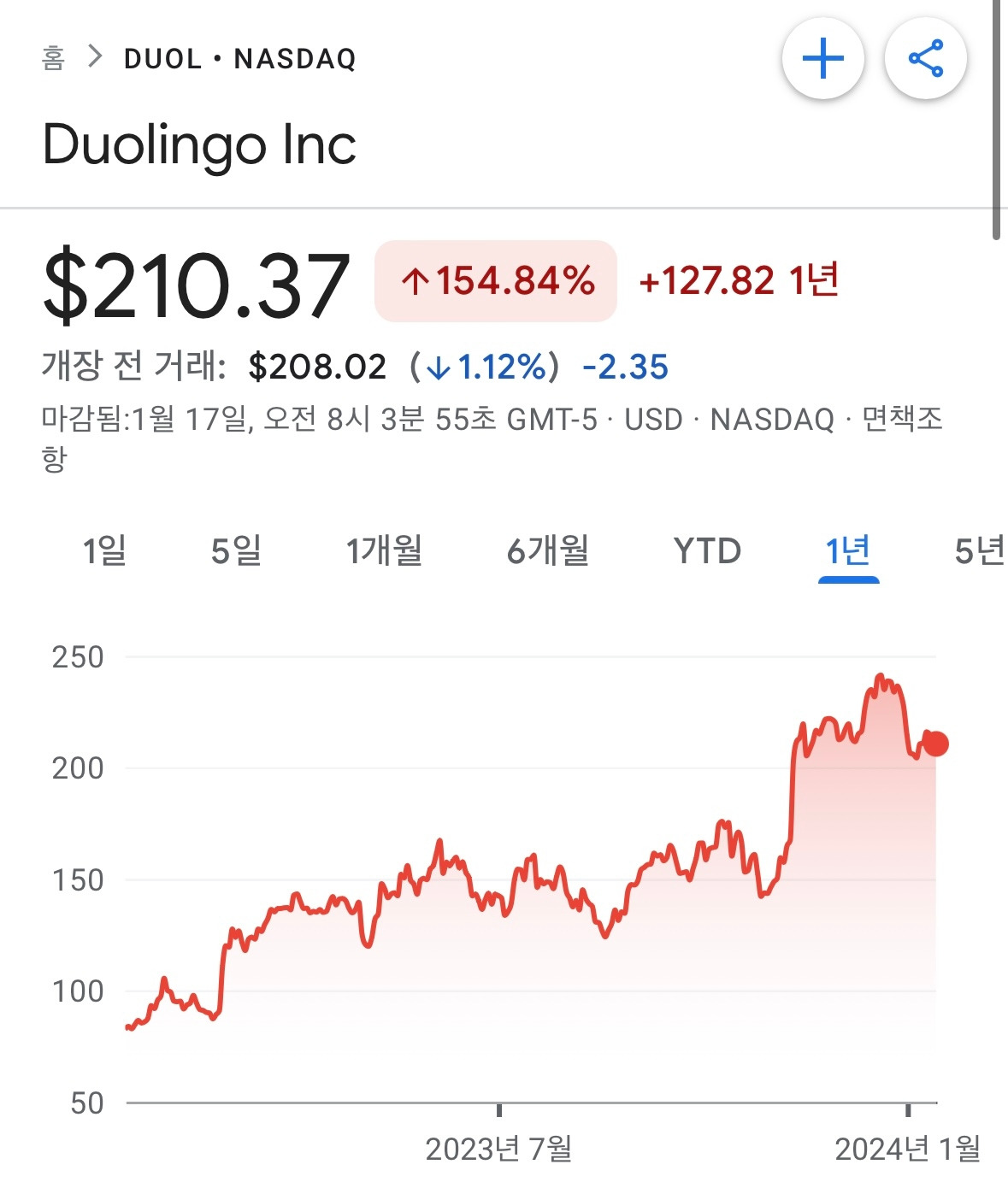 무료로 사용할 때, 듀오링고는 5개의 하트를 제공한다. 학습을 하면서 틀릴 때마다 하트는 소진된다. 일정 시간이 지나거나 광고를 보면 하트를 획득할 수 있다. 슈퍼듀오링고라고 불리는 유료 구독 서비스를 이용하면 이 하트는 무한대가 되며, 광고를 보지 않아도 된다. 사람들의 새해 결심이 가장 강력해지는 1월에 이 유료구독제를 할인한다. 이 유료구독 서비스가 견고한 수익모델이 되어 지난 1년 간 주가는 154.84% 상승했다. AI가 본격화되는 2024년에는 또 어떤 성장을 이어나갈 수 있을지 듀오링고의 미래가 궁금해진다.