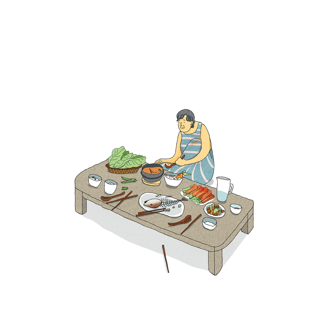 왜 다 같이 있는 모습이 기억에 잘 그려지지 않을까, 하다가 생각해보니 엄마는 늘 마지막에 밥을 혼자 드셨다. 생선을 굽고, 나물을 무치고, 찌개가 다 끓여질 때 즈음 우리 가족은 모여 앉아 밥을 먹었다. 하나씩 요리가 완성이 될 때마다 허기진 배를 채우고는, 하나둘 씩 자리를 떠났다. 엄마는 우리가 다 먹고 난 뒤, 뒤늦게 어질러진 상에 앉아 김치를 꺼내 남은 반찬들과 식사를 하셨다.
