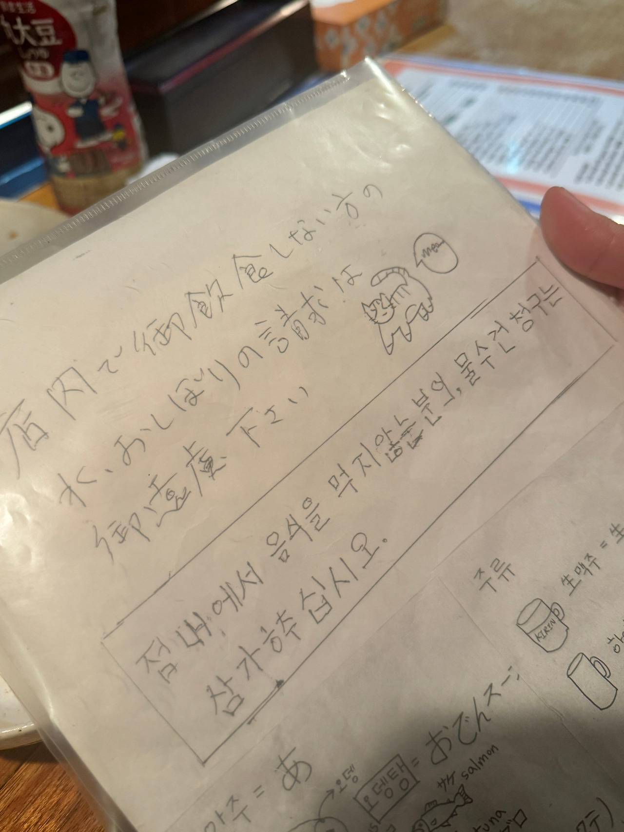 이자카야에 들어가니 안 쪽에는 일본인들이, 바깥 쪽 테이블에는 한국인 두 명이 앉아있었다. 늦은 시간인데도 사람이 꽤 있었다. 안 쪽에 앉은 일본인들은 실내 흡연을 하고 있었다. 한국에서는 볼 수 없던 광경이라 당황스러웠지만 일단 앉아서 주문을 했다. 일본어 메뉴판 말고도 어설픈 글씨체로 쓰여진 한국어 메뉴판이 있었다. 주인 아주머니께서는 한 눈에 내가 한국인임을 딱 알아보고 그 메뉴판을 건네주셨다.