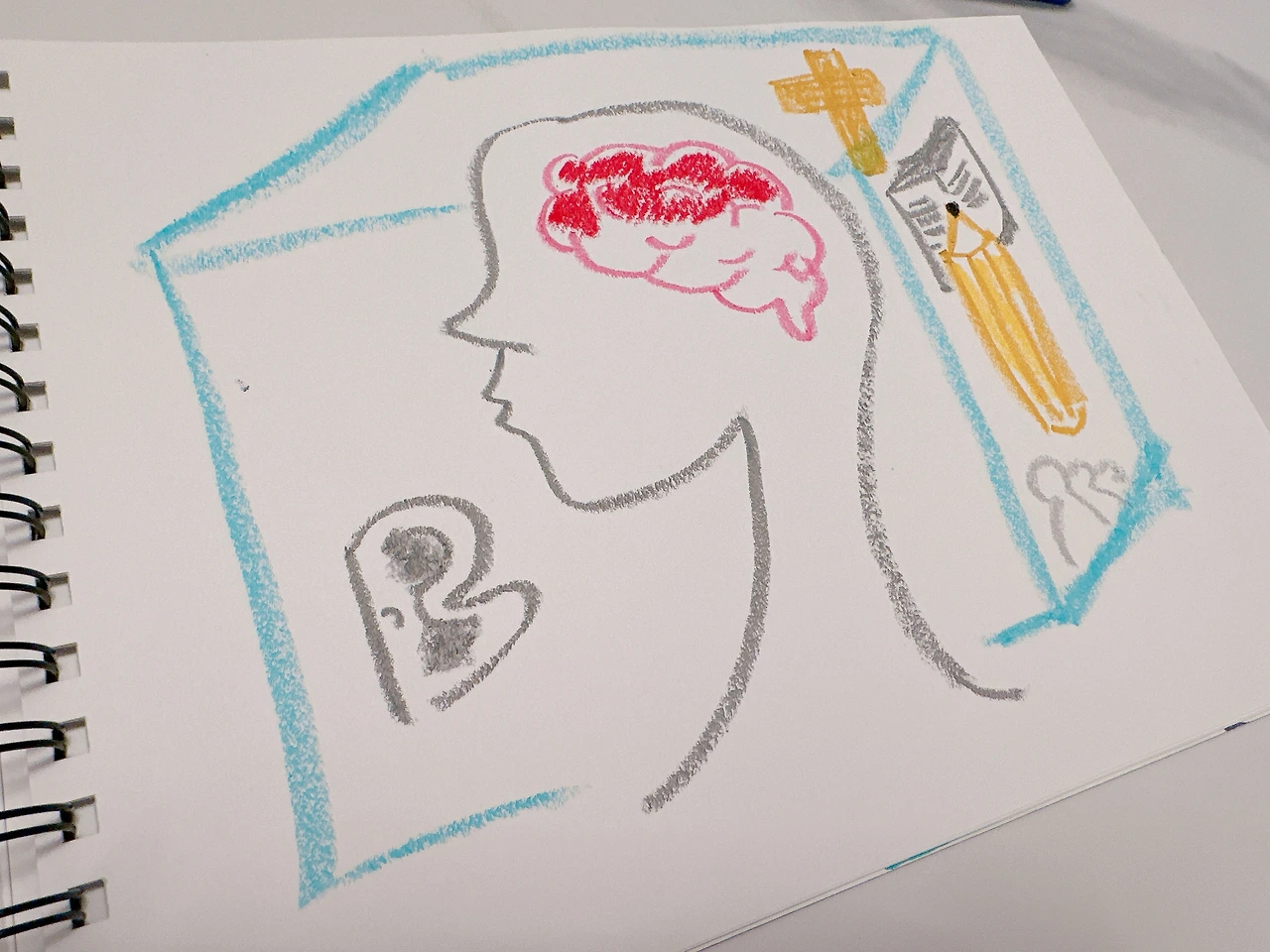 상담 선생님과 안부를 나누고 상담선생님께서 내주신 숙제를 함께 보았다. 숙제로 내주셨던 그림의 주제는 삶에서 무엇을 붙들고 살아왔는지에 대한 이야기였다. 나는 그림 공책의 가운데에 우선 사람의 머리와 대뇌 부분을 그렸다. 내가 평생 붙들고 살아왔던 것은 어쩌면 나의 의식이었기 때문이다. 내가 듣고 배우고 생각한 것들을 토대로 나는 열심히 살아왔었다. 그리고 나의 신앙, 주위에서 나를 지켜주고 있던 사람들 그들이 나를 살게 했던 것 같다.