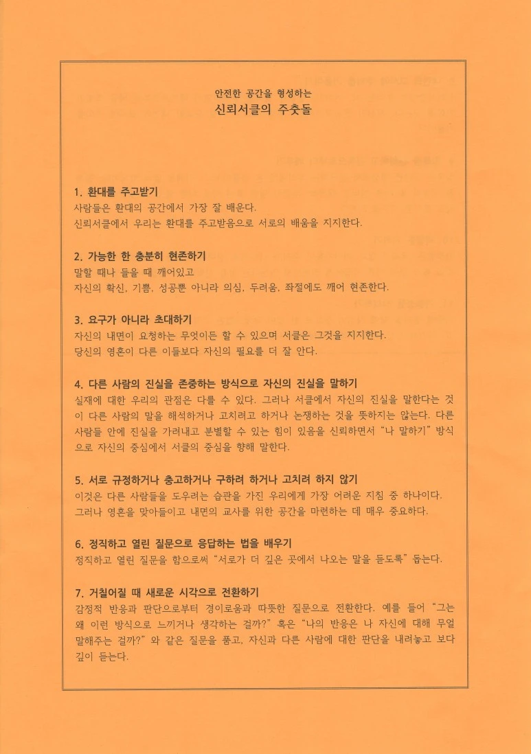 두 번째 서클은 이번 명절의 글램핑에서 나누었던 질문이다. 우리 가족은 모닥불을 가운데 두고 서클을 시작했다. 나무를 태우며 불타오르는 모닥불에 우리의 삶의 고통과 아픔이 모두 씻기어지고 다시 새로운 마음이 되기를 기도하며 서클을 시작했다. 서클의 약속인 주춧돌을 나누었다. 환대를 주고받으며 이 순간에 현존하기. 확신, 기쁨 성공뿐 아니라 의심, 두려움, 좌절에도 깨어 현존하기. 우리의 내면을 초대하며 진실로 이야기하기. 이 소중한 주춧돌이 서클을 더 안전하게 만든다.