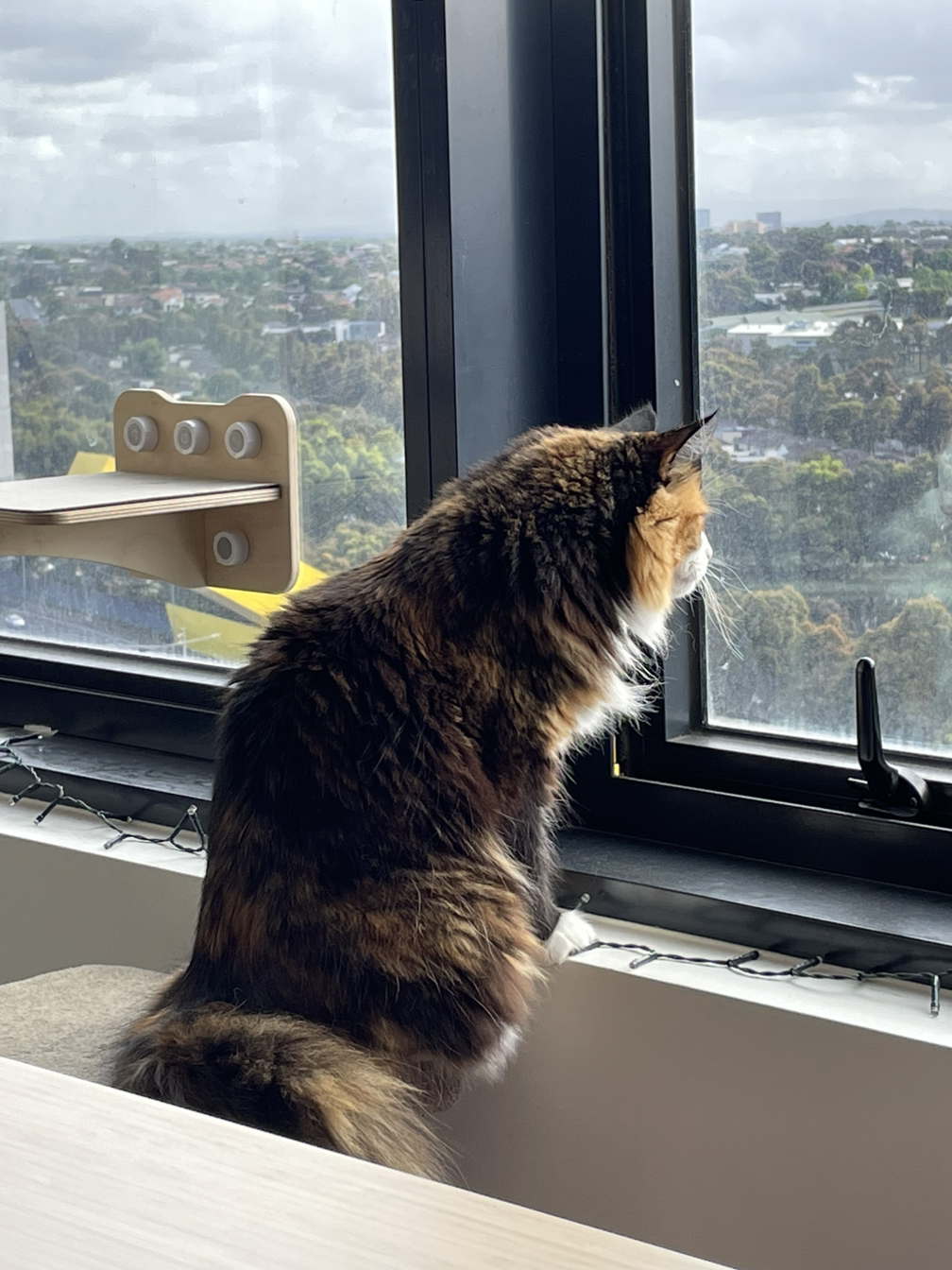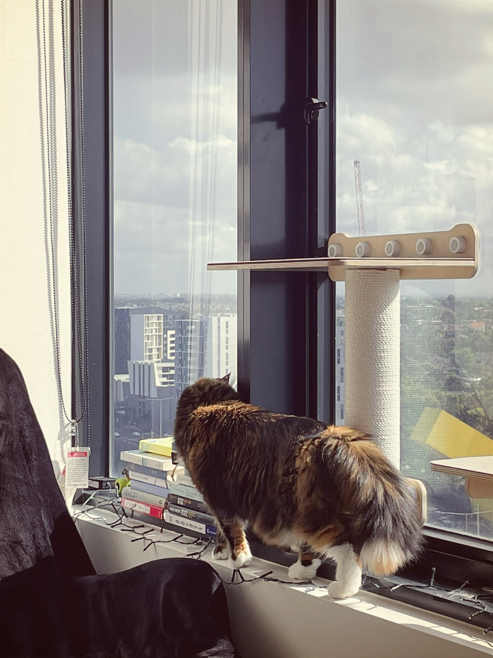 고양이는 야행성이라 주로 밤에 활동한다는 건 알고 있었지만 이렇게 잠을 많이 자는지는 몰랐다. 오전에는 그래도 비교적 활동적이다. 아침에 일어나면 나에게 다가와 소리 내며 인사해주고 몸을 비벼댄다. 아침을 먹고 난 후에는 따뜻한 햇살 아래에서 잠을 자거나 바깥 풍경을 구경한다. 말똥말똥 눈을 뜨고 있으면 이비가 좋아하는 장난감으로 신나게 놀아준다. 놀고 나면 배가 고픈지 간식이나 사료를 먹는다. 그리고서는 자러 들어간다.