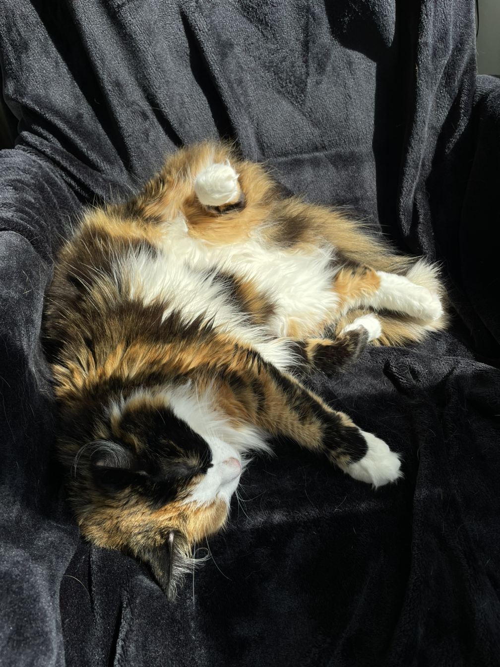 이비가 우리 집에 머무는 동안 관찰해보니 이비의 루틴은 이러했다. 아침에는 따뜻한 햇살을 품은 러그 위에서 뒹굴며 기분 좋은 하루를 시작한다. 아침을 먹은 뒤 창가에서 창밖을 구경하고 창가에 있는 의자에서 잠을 잔다. 거의 저녁 먹기 전까지는 잠만 잔다. 중간에 잠깐 나오긴 하지만 다시 자러 들어간다.