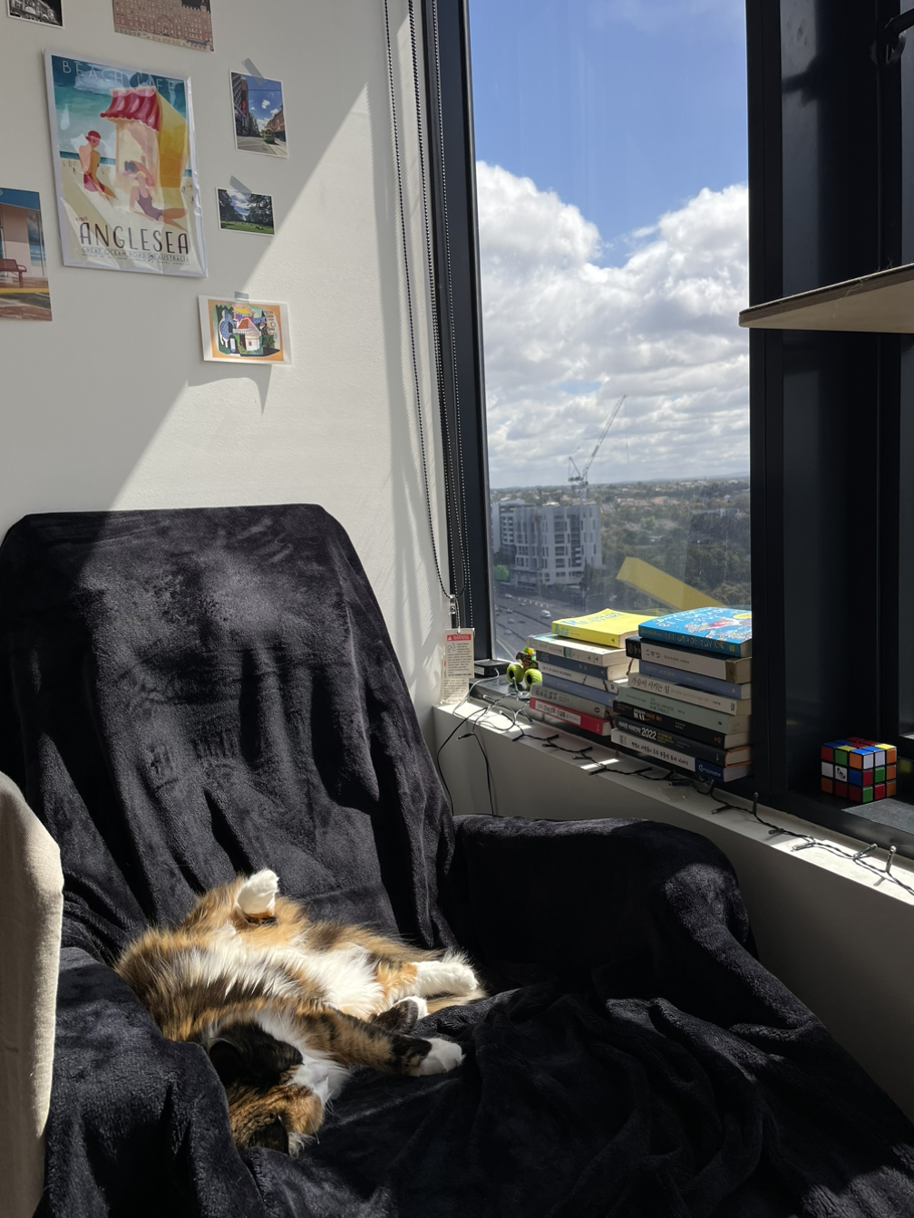 어느 정도 이비가 햇살 마사지를 즐기고 나면 나도 토스트 준비가 끝나고 이비는 식탁 바로 옆에 앉아서 나와 함께 아침을 먹는다. 밥을 먹고 나면 이비는 창가로 간다. 창밖 보는 걸 좋아한다. 풍경을 한참 구경하다가 따뜻한 햇살에 취해 나른해진 이비는 이제 자러 간다. 창가에 있는 폭신한 의자로 가서 벌러덩 눕는다. 해가 강렬하게 들어와 이비의 털이 뜨끈뜨끈해져도 아랑곳하지 않고 그곳에서 4~5시간을 계속 잔다.
