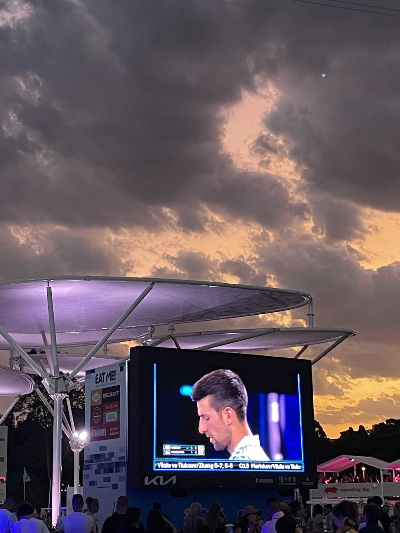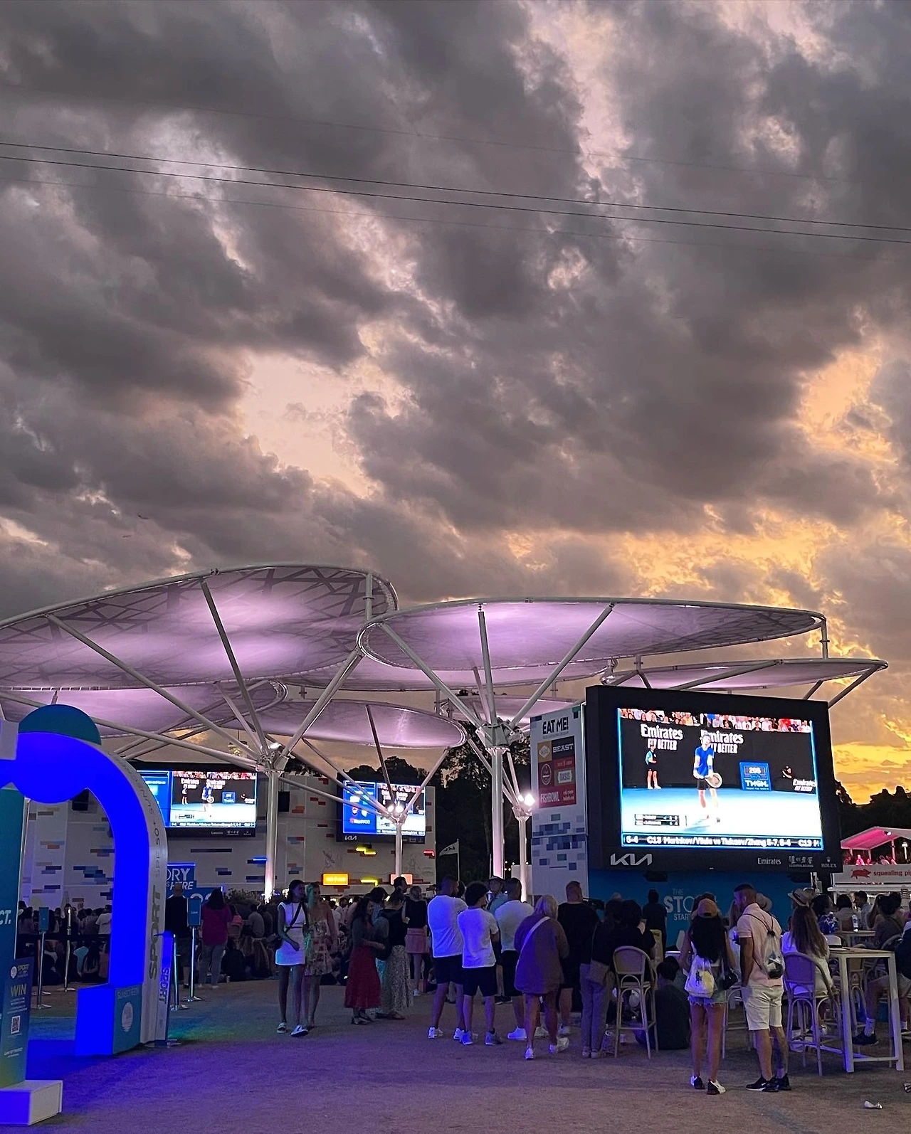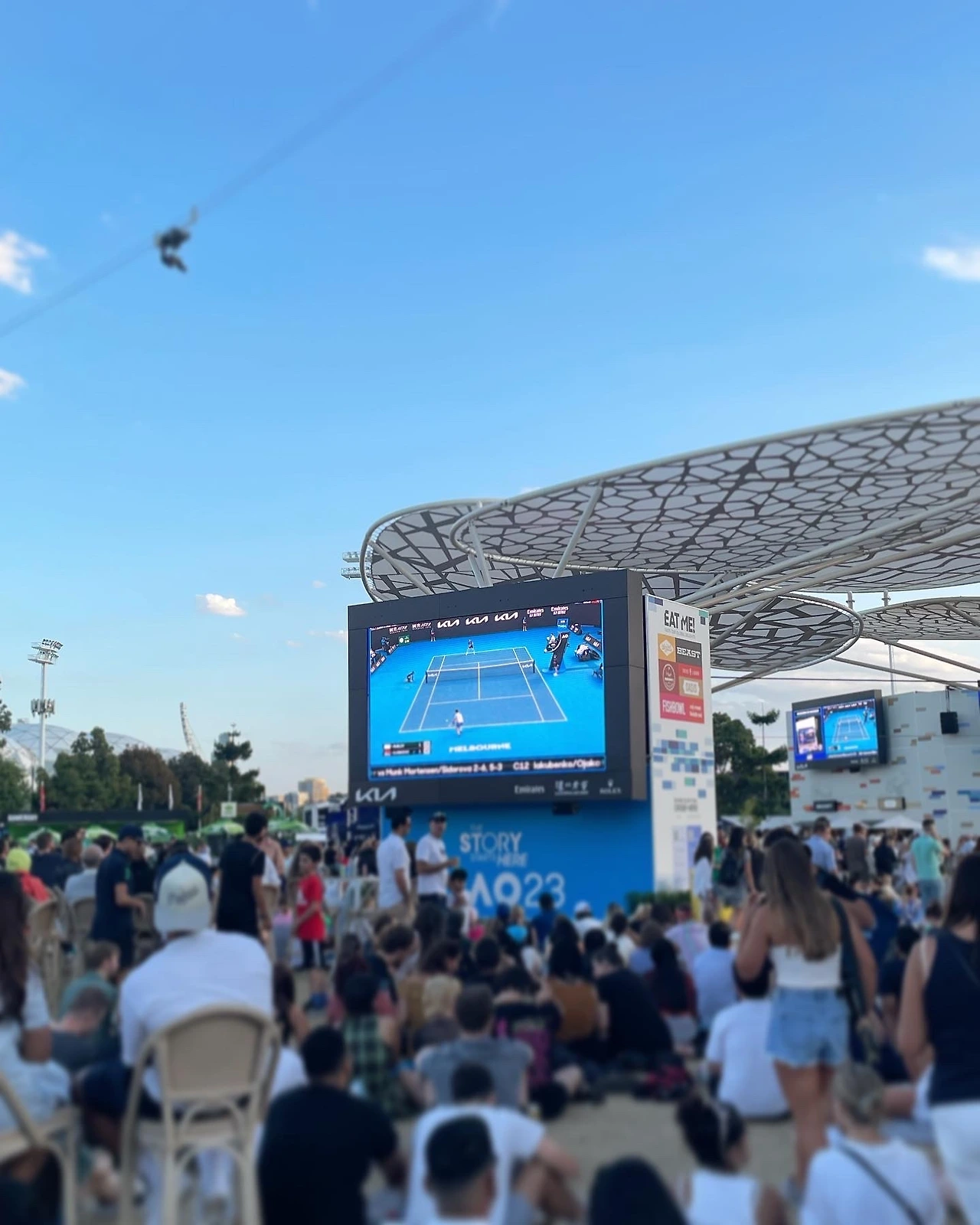 야외에는 큰 전광판으로 관람할 수 있는 공간이 있고 음식을 사 먹을 수 있는 푸드 코트가 있으며 펍이 마련되어 있다. 푸드 코트를 중심으로 테이블과 의자가 많이 놓여 있고 잔디밭에 앉아서 마치 소풍처럼 즐길 수도 있다. 테니스를 볼 수 있는 전광판이 많기 때문에 적당한 자리를 골라 앉으면 된다. 이게 나의 첫 AO 경험이었다.