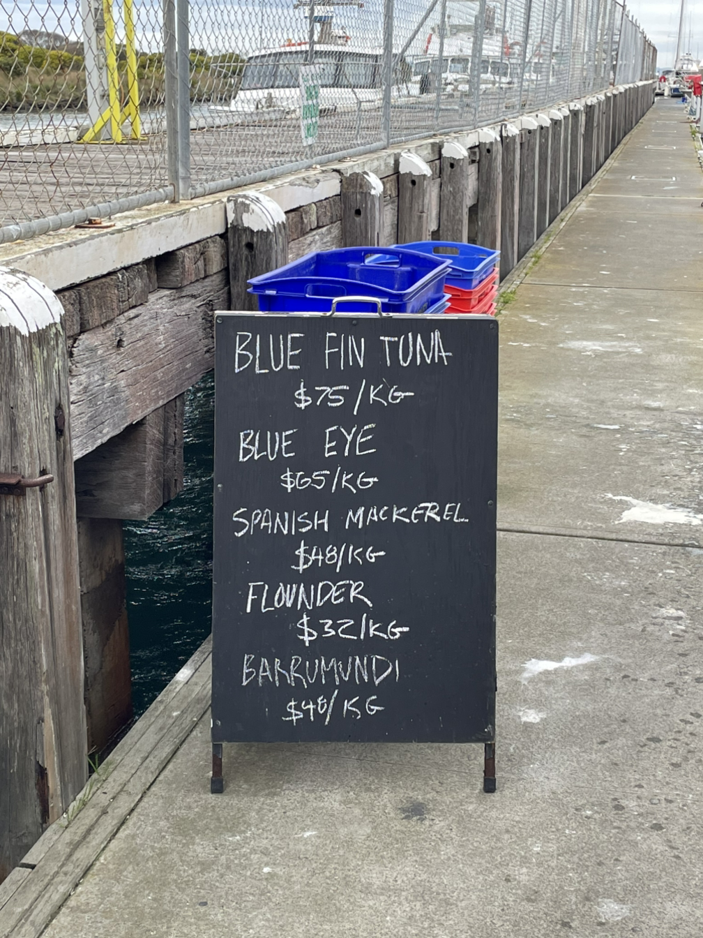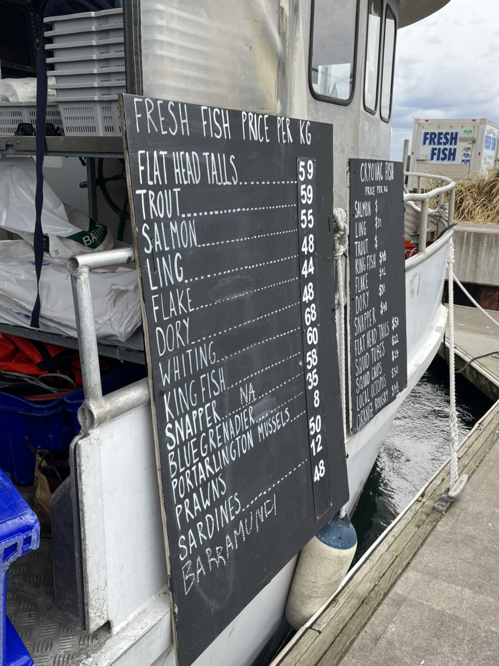 가까이 가보니 요트를 개조해서 만든 가게가 아닌 실제로도 요트로 사용하고 있는 거 같았다. 그래도 제법 가게답게 간판도 달려있고 앞에 메뉴판도 있었다. 메뉴판은 사실 봐도 잘 모르겠다. 우리나라 어종과 다르기도 하고 생소한 이름이 많았다. 이럴 땐 추천을 받으면 된다. 우린 스튜로 해 먹을 해산물과 회로 먹을 생선을 추천해달라고 했다. 추천받아 뭔가 사긴 했는데 이름은 기억이 안 난다. 횟감으로는 킹피쉬(King fish)를 추천받아 샀다.
